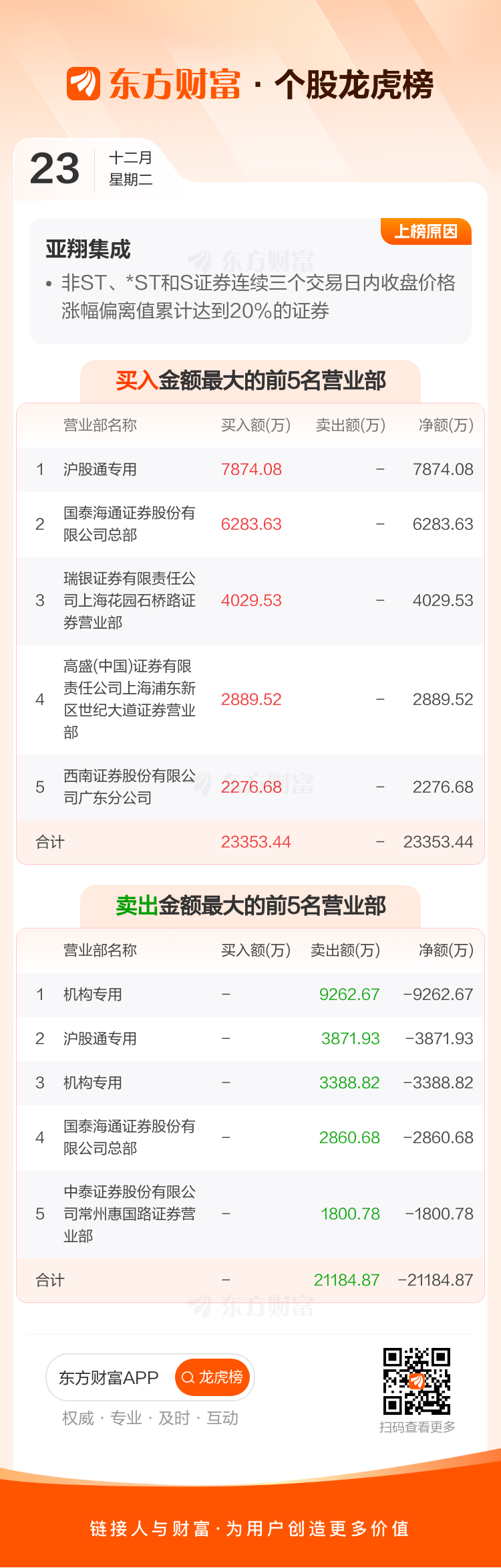 交易所2025年12月23日公布的交易公开信息显示,亚翔集成因成为非ST、*ST和S证券连续三个交易日内收盘价格涨幅偏离值累计达到20%的证券上榜。亚翔集成当日收报108.31元,涨跌幅10.00%,换手率3.82%,成交额8.75亿。异常期间12月22日至12月23日,期间涨幅21.00%,累计偏离值20.25%,区间成交额14.26亿。