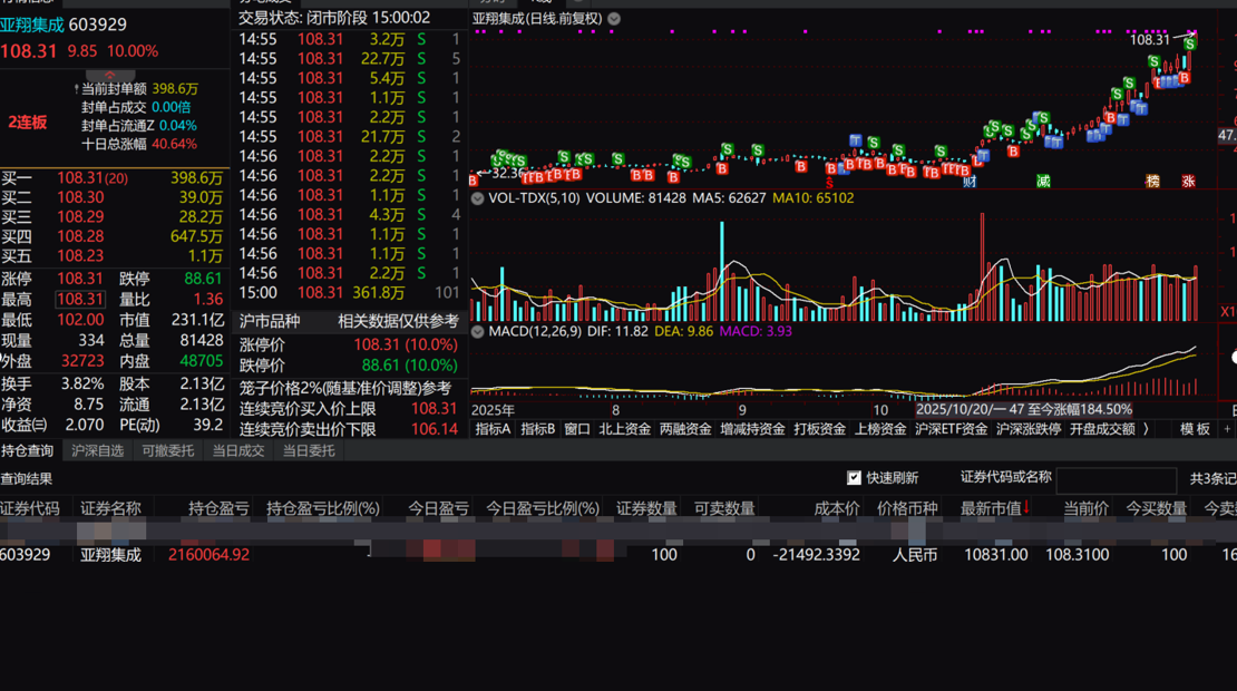 从9月30号第一次25.09元买入2600股开始,到今天108.31全部清仓,一年多的时间,虽然中间也有很多煎熬的时刻,也有很多后悔的操作,但总体方向的把握和判断自认为还是非常不错的。在低位时非常坚定的相信亚翔是被低估的,在今年1、2季度业绩不如预期的情况下持续加仓,在三季度业绩兑现后,能够拿住筹码,没有被轻易洗下车,在这一路的过程中,在股吧内也陆续发了20多篇评论和分析,直到今天,收益达到了自己的预期,除了给自己留了100股作为纪念之外全部清仓。虽然非常的不舍,但也到了该跟这段邂逅说再见的时刻了。再见亚翔,再见吧里的朋友们,也祝亚翔业绩不断高涨,股价一路长红,祝持仓的朋友们能有好的收益。也许过段时间我还会回来,但我相信那将会是另外一段美妙邂逅的开始。
