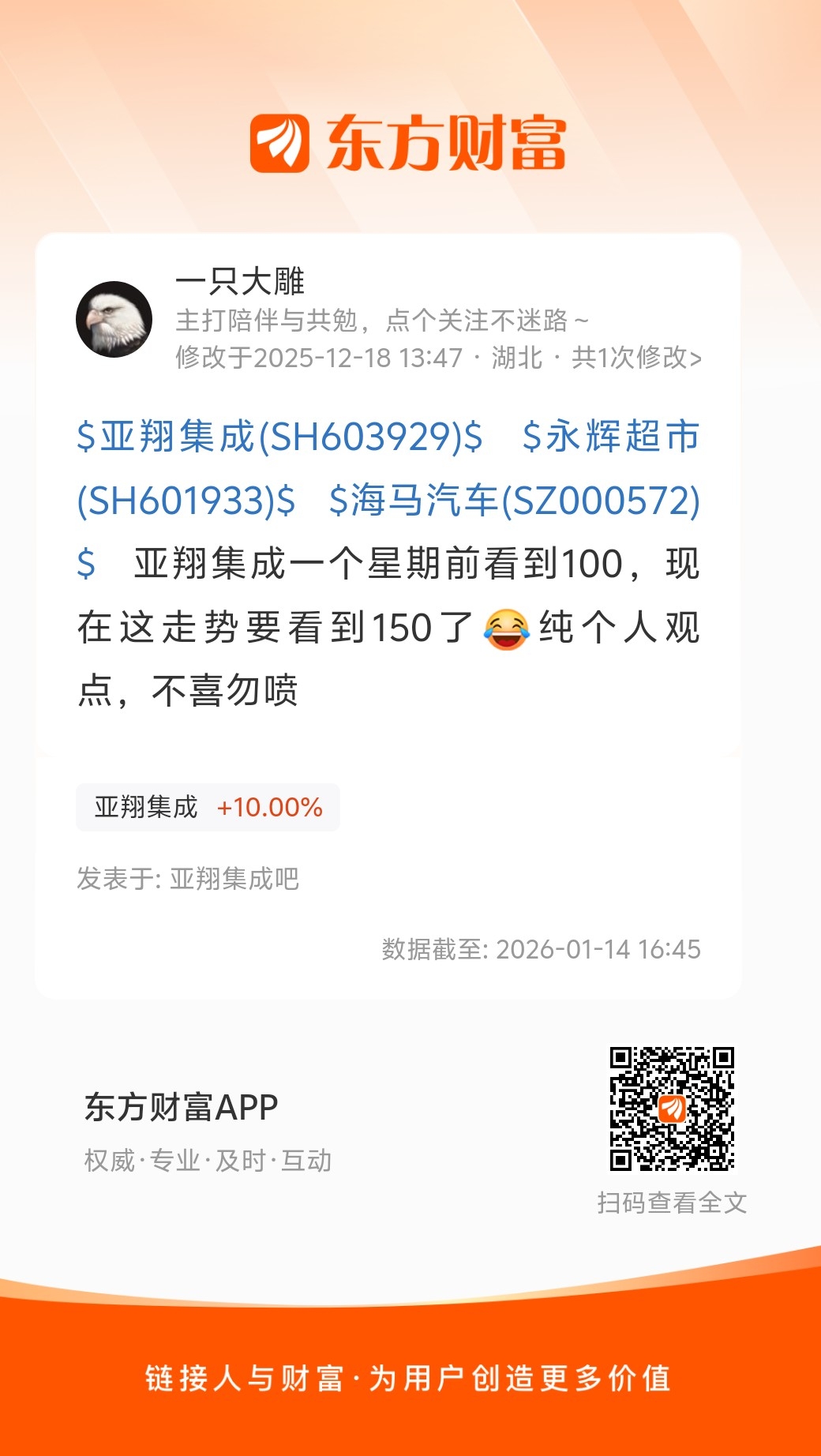 温馨提示: 1.根据《证券法》规定,禁止编造、传播虚假信息或者误导性信息,扰乱证券市场;2.用户在本社区发表的所有资料、言论等仅代表个人观点,与本网站立场无关,不对您构成任何投资建议。用户应基于自己的独立判断,自行决定证券投资并承担相应风险。《东方财富社区管理规定》