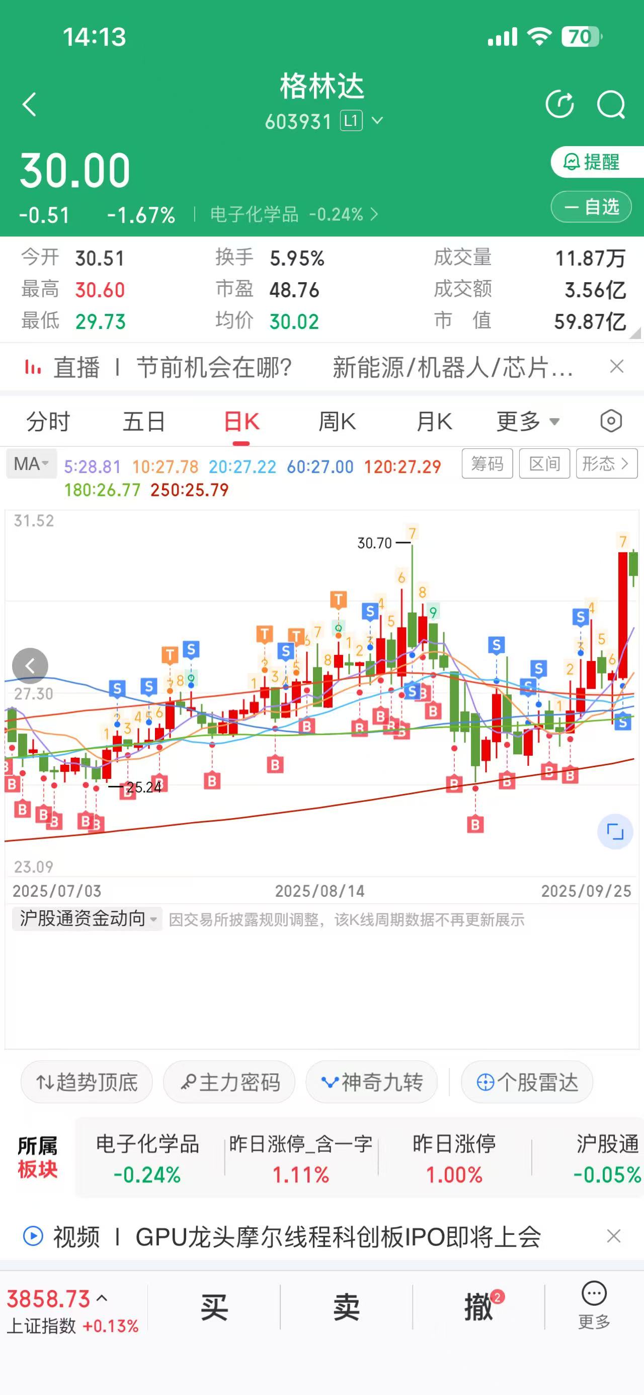 在这个票上反复做了大概五年,赚的不多,七八万块钱吧。昨天涨停,清仓。他没有连板基因,特点就是到了30就开始派送筹码。上一次是减持结束后开始涨,这一次反过来,是减持公告前开始涨,不要以为还会像上次一样,格林达属于光刻胶的后排,大概率会从30一直阴跌一个月到25-26区间。散户可以翻看日K图,基本上每次都这样。都好自为之吧,追涨进来的,悬。祝大家好运吧。可低吸,不追高。