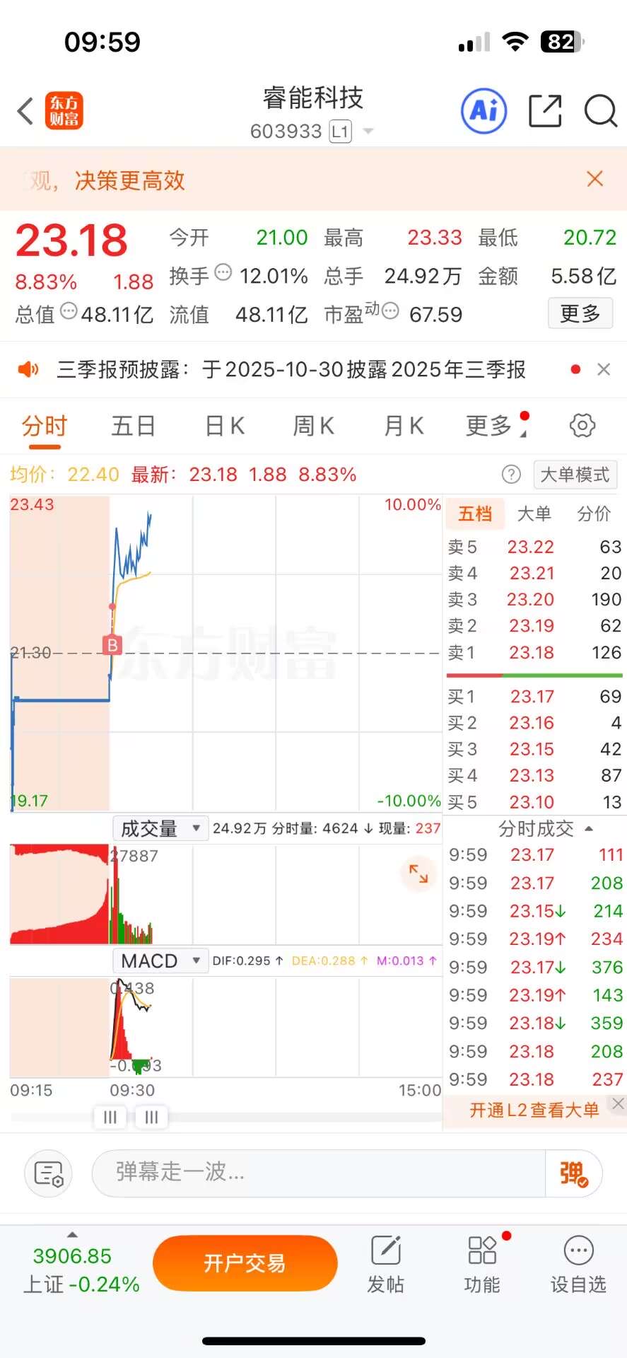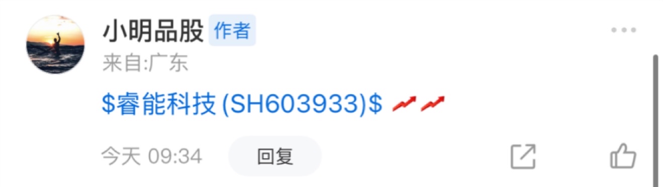 $睿能科技(SH603933)$ 不负众望成功上板!相信大部分同学都跟上了吧?34分时明哥就分享出来了同学们你们的点赞评论呢?这样的战绩都开始潜水那明哥也不更新了~
