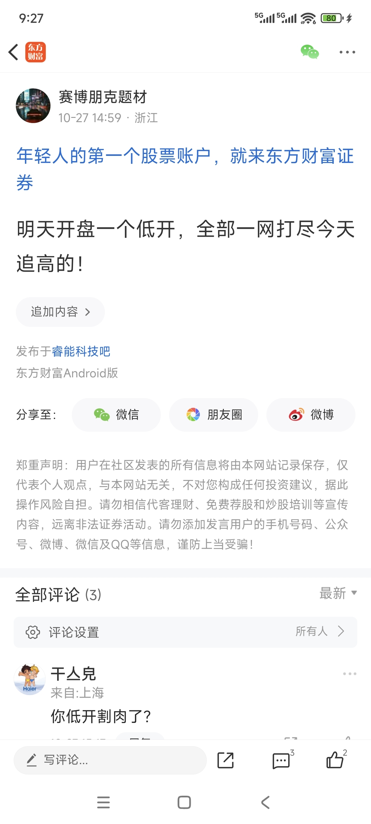 温馨提示: 1.根据《证券法》规定,禁止编造、传播虚假信息或者误导性信息,扰乱证券市场;2.用户在本社区发表的所有资料、言论等仅代表个人观点,与本网站立场无关,不对您构成任何投资建议。用户应基于自己的独立判断,自行决定证券投资并承担相应风险。《东方财富社区管理规定》