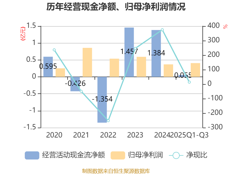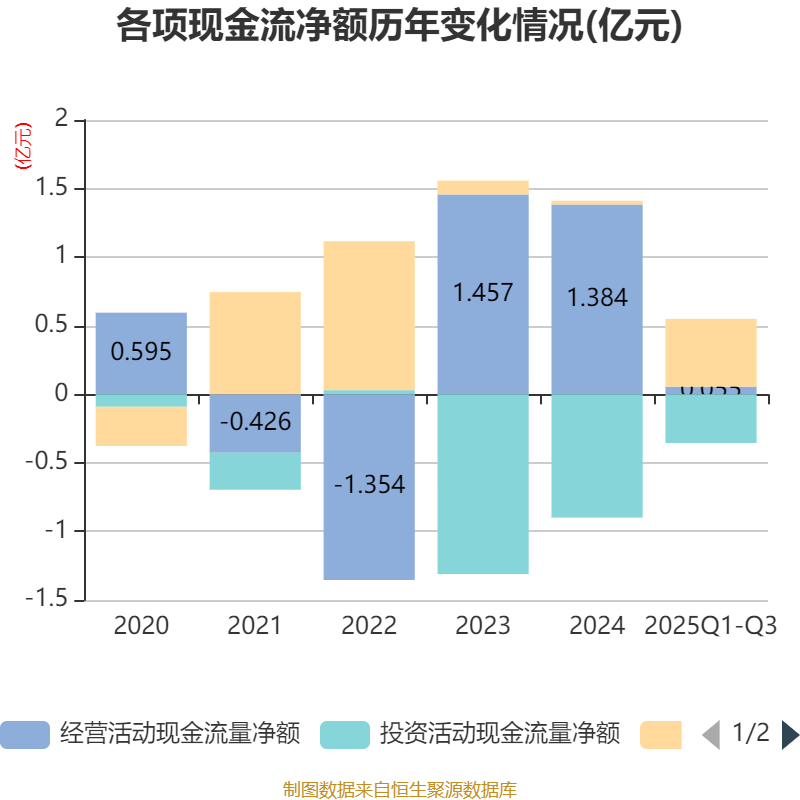 2025年前三季度,公司经营活动现金流净额为550.85万元,同比下降95.76%;筹资活动现金流净额4945.5万元,同比增加1.12亿元;投资活动现金流净额-3554.36万元,上年同期为-5620.86万元。