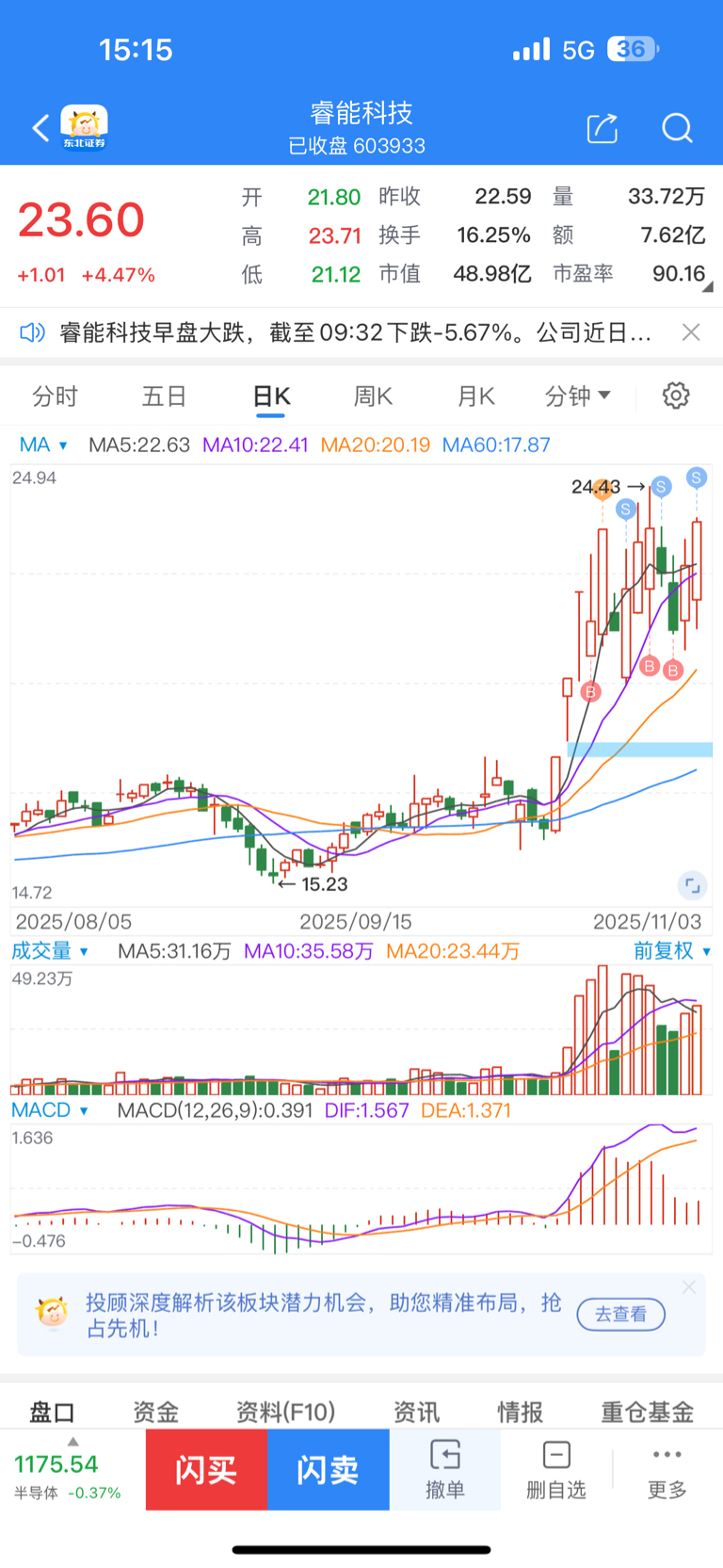 $睿能科技(SH603933)$ 清仓离场了,明天低开继续进,高开我就拍大腿!