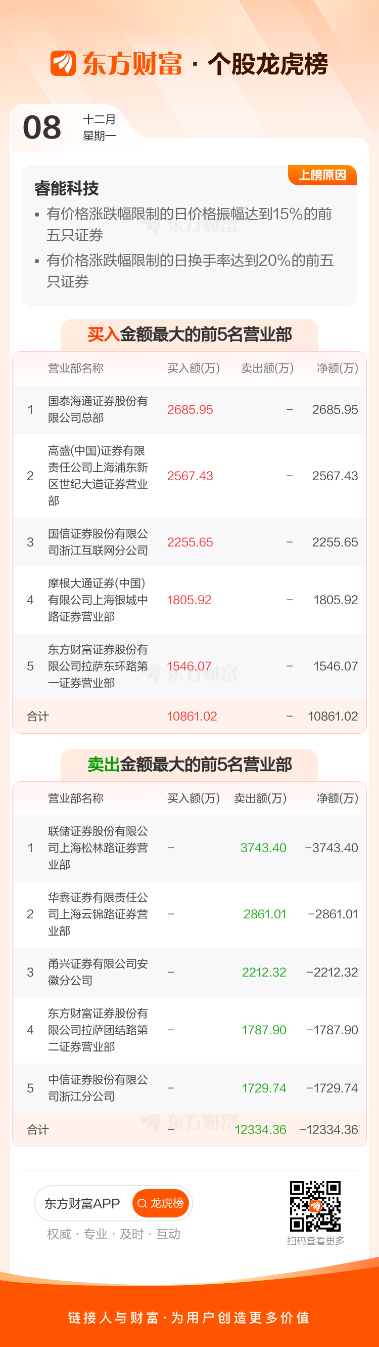 交易所2025年12月8日公布的交易公开信息显示,睿能科技因成为有价格涨跌幅限制的日价格振幅达到15%的前五只证券、有价格涨跌幅限制的日换手率达到20%的前五只证券上榜。睿能科技当日收报31.55元,涨跌幅6.55%,偏离值22.14%,换手率25.79%,成交额15.19亿。