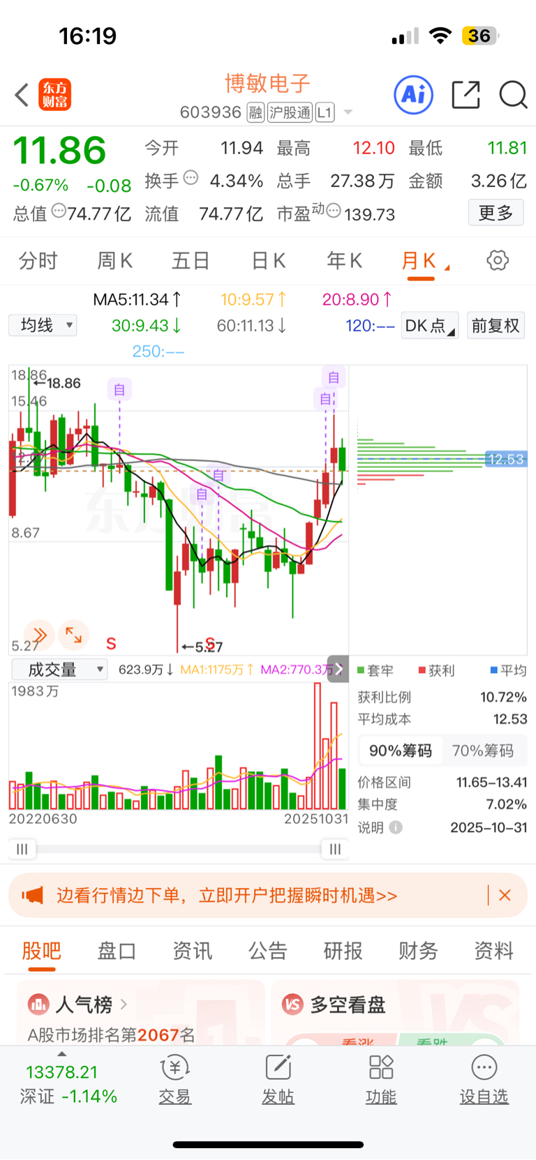 $博敏电子(SH603936)$ 博敏15到11,套了一批韭菜在上面。不过筹码还需要充分交换。目前只是10月回吐了9月收益,不过老韭菜在6.7.8三个月赚麻了。博敏11月,12月大概率震荡充分换筹码,顺便挖个坑。为26年准备了。