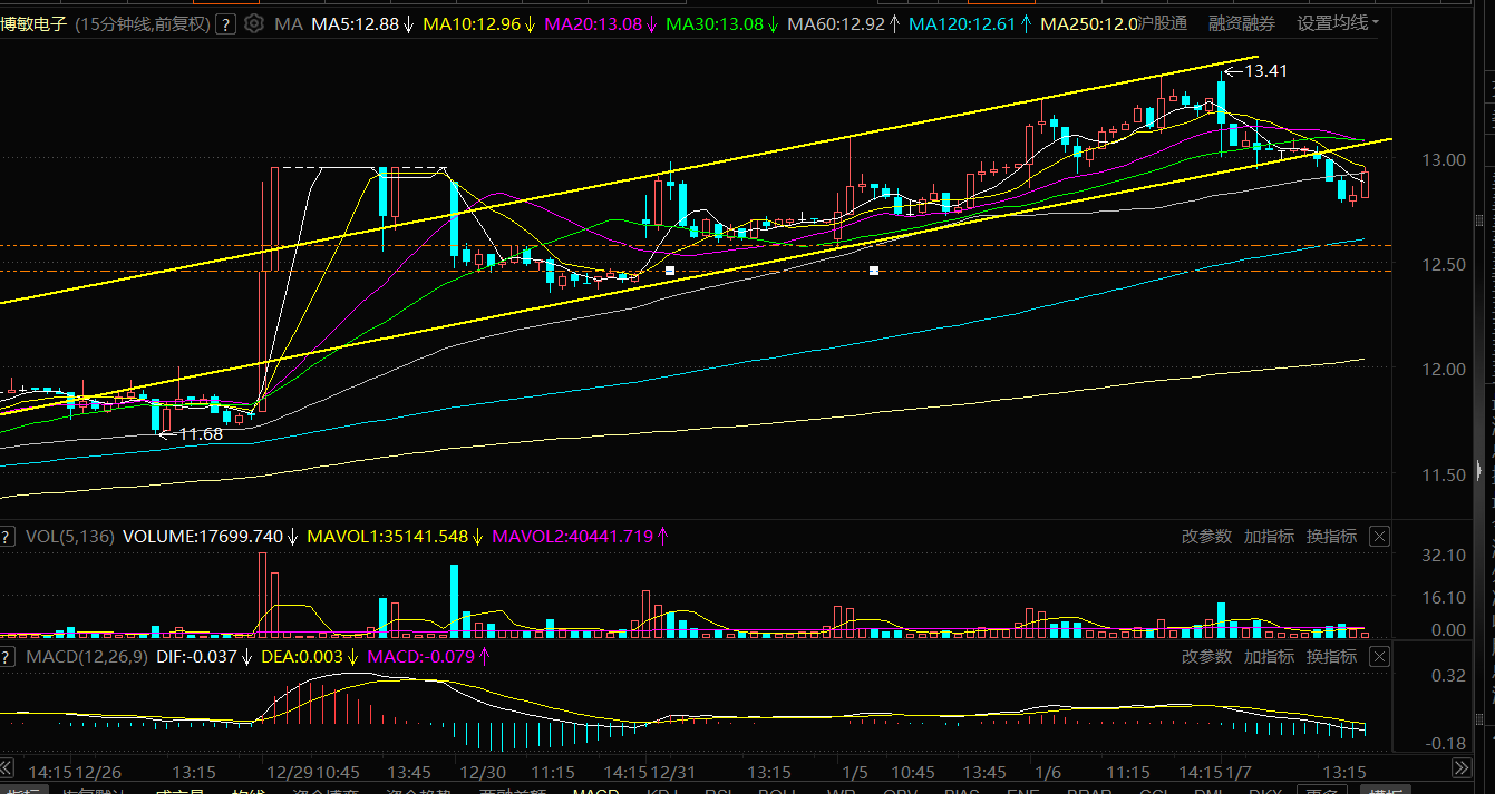 强势整理不变,仍然在5日线之上,15分钟K显示:上升通道跌破,此时正在反抽中,12.55以下有个跳高缺口,引力告知月线遇阻会有反复,因此13.16以上要做T,而靠近缺口要买回。