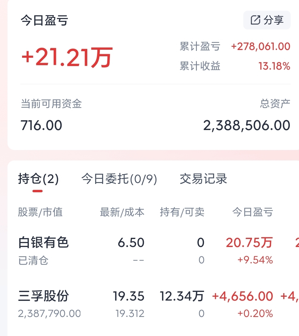 清仓白银有色,开仓三孚股份完成10月份第二周的交易!期待自己第三个100W