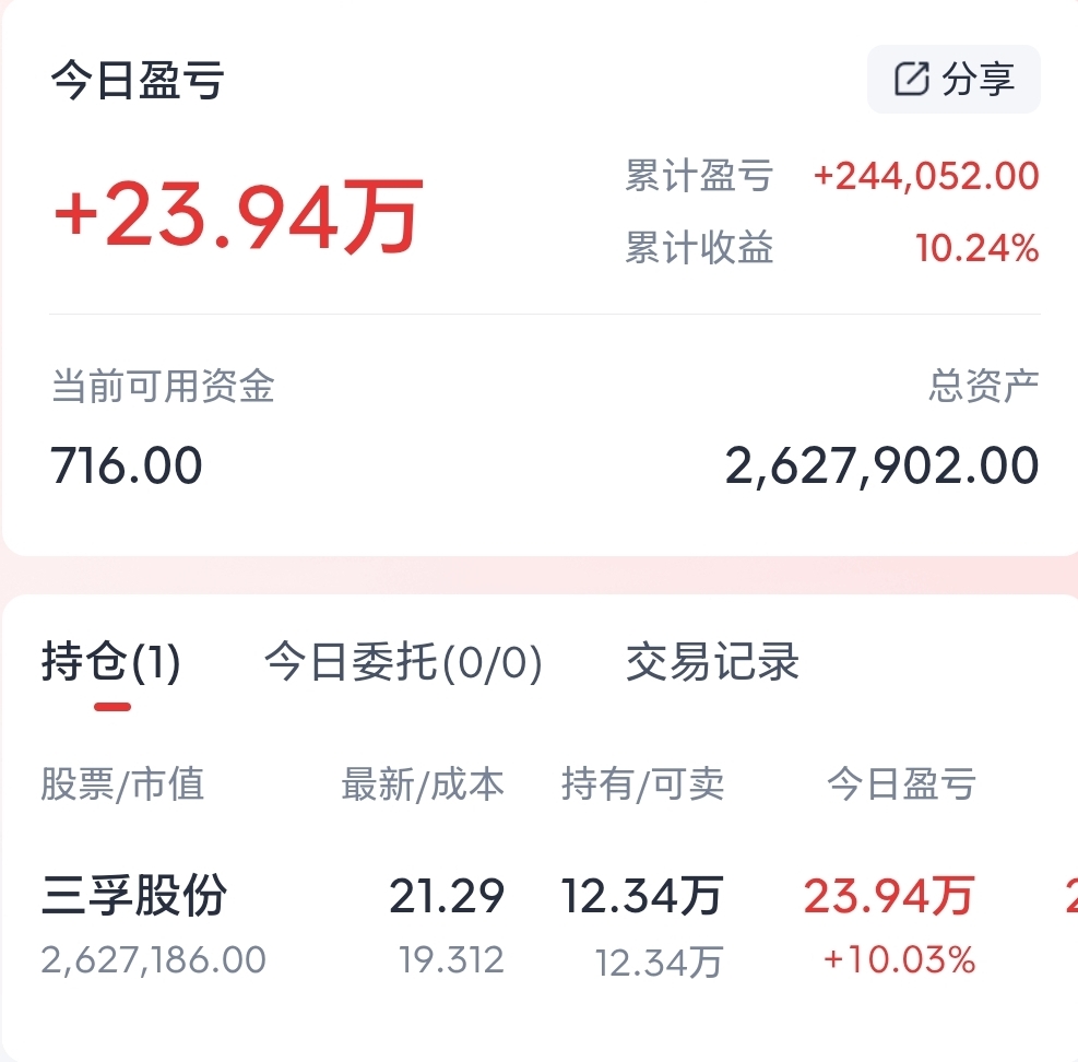 $三孚股份(SH603938)$ 第三个一百W(明天是第21天)资金大概率可以到290W!距离第三个一百W越来越近了!
