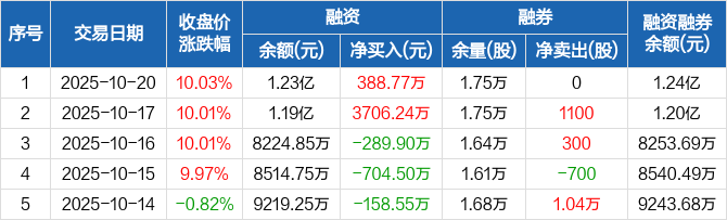 融资方面,当日融资买入3125.8万元,融资偿还2737.03万元,融资净买入388.77万元。融券方面,融券卖出0股,融券偿还0股,融券余量1.75万股,融券余额37.26万元。融资融券余额合计1.24亿元。