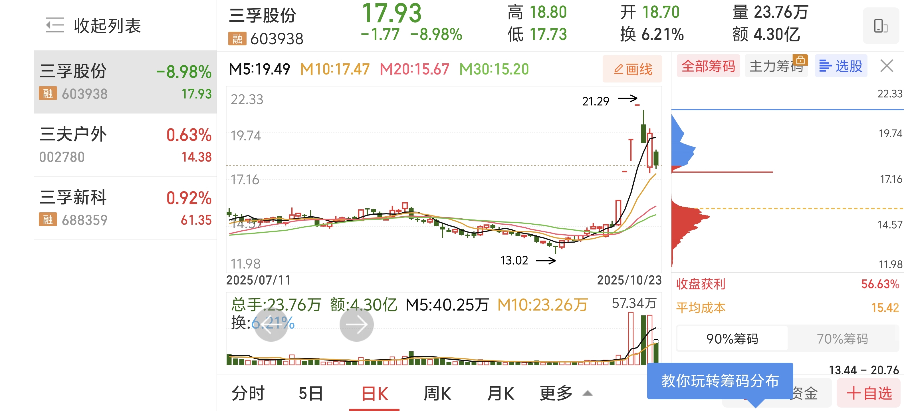 $三孚股份(SH603938)$ 东方财富筹码峰作假,图片是我在其他软件上看的筹码峰,助力都出完了