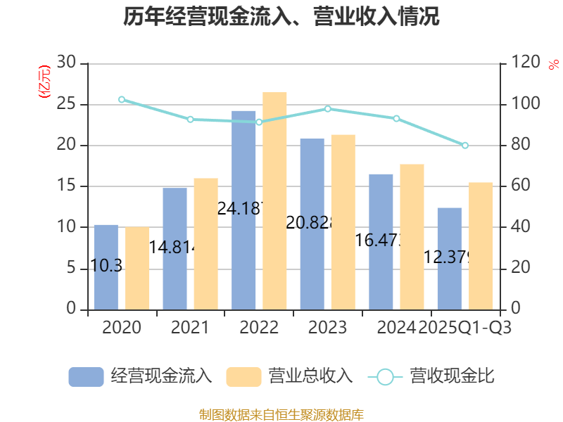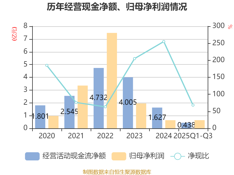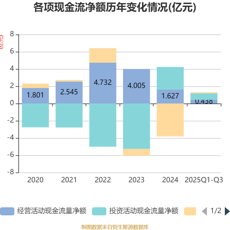 2025年前三季度,公司经营活动现金流净额为4377.43万元,同比下降52.97%;筹资活动现金流净额1267.2万元,同比增加1.09亿元;投资活动现金流净额7400.01万元,上年同期为3.17亿元。