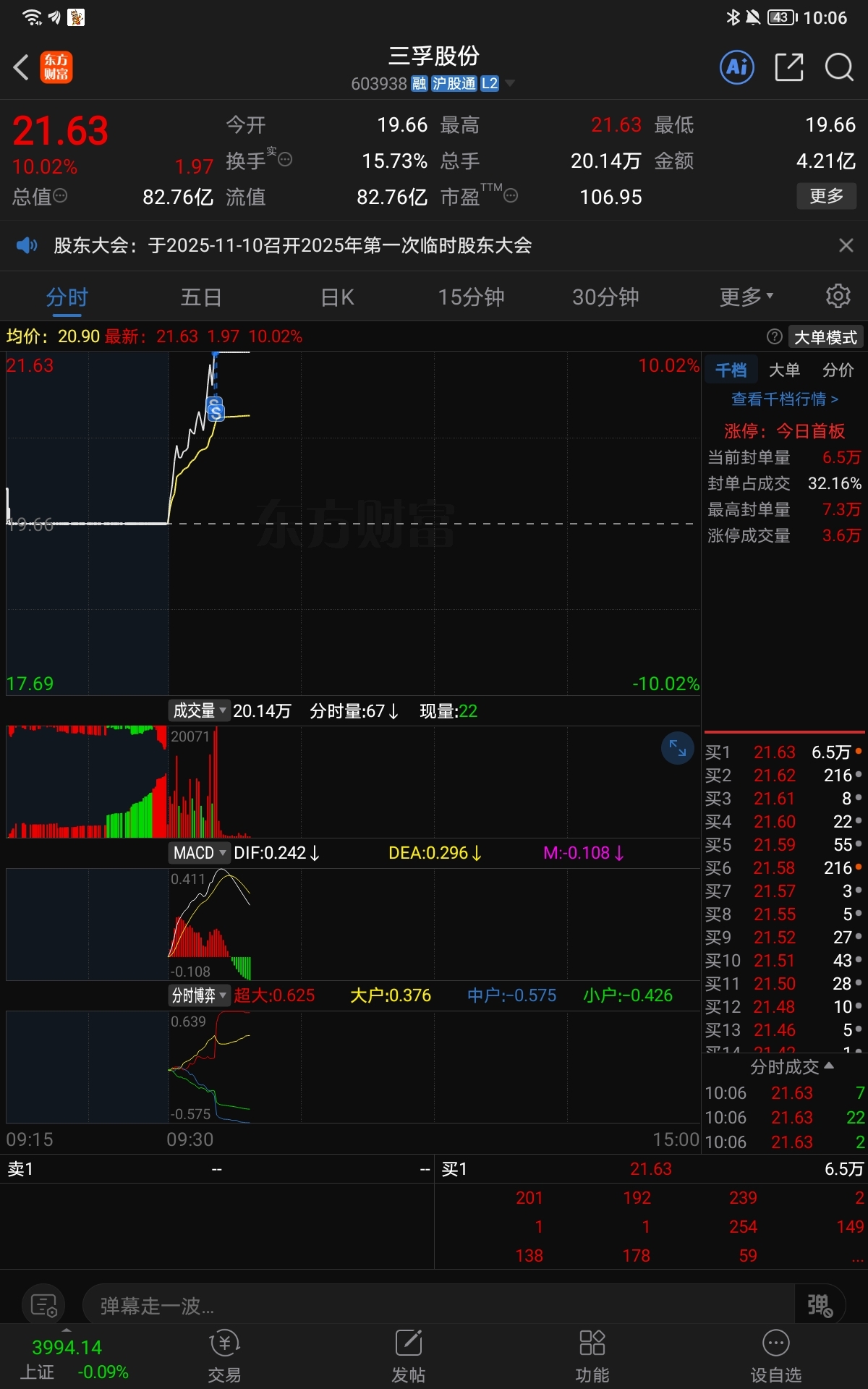 $三孚股份(SH603938)$ 涨停价出清,各位发财