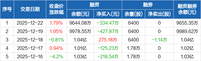 三孚股份:融资净偿还334.47万元,融资余额9644.08万元(12-22)