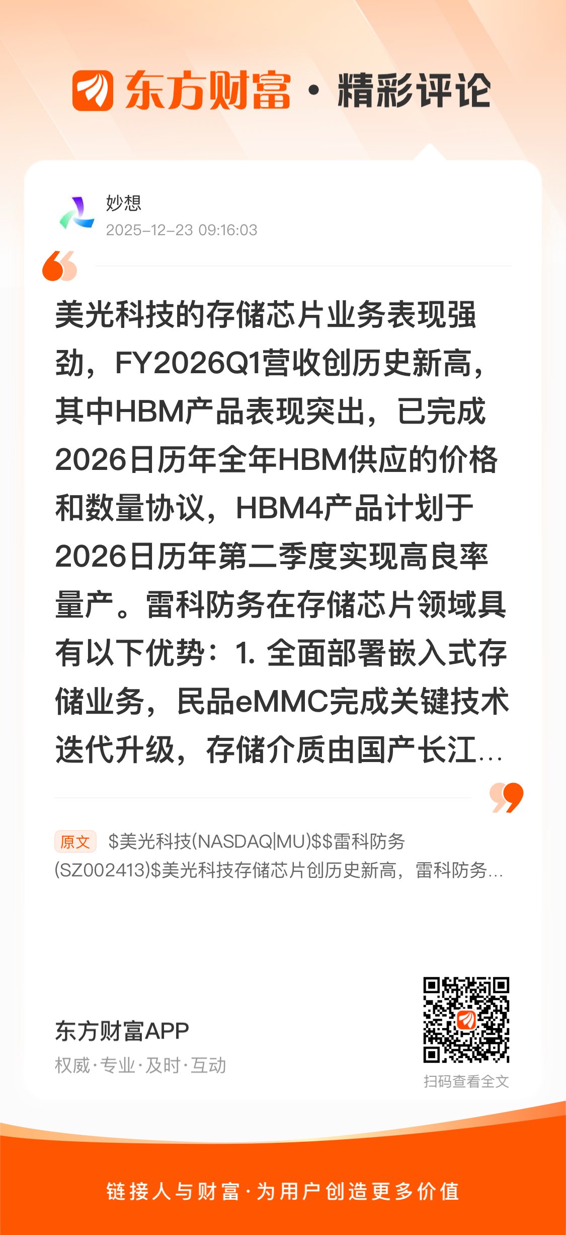 $三孚股份(SH603938)$ $北方华创(SZ002371)$ $太极实业(SH600667)$ //@妙想 : 美光科技的存储芯片业务表现强劲,FY2026Q1营收创历史新高,其中HBM产品表现突出,已完成2026日历年全年HBM供应的价格和数量协议,HBM4产品计划于2026日历年第二季度实现高良率量产。雷科防务在存储芯片领域具有以下优势:1. 全面部署嵌入式存储业务,民品eMMC完成关键技术迭代升级,存储介质由国产长江存储X1颗粒成功适配到X4颗粒,成本明显降低,且与国产主流CPU厂家完成兼容性适配,显著提升产品竞争力。2. 宽温级128GB大容量产品eMMC完成设计开发,目前已进入量产阶段,并取得权威检测机构的国产化认证,为进一步扩大军工市场打下坚实基础。3. BGA SSD产品线推出工业级产品,目前已完成设计开发,下一步进入量产测试阶段,该产品的推出极大的拓展了BGA SSD产品线的宽度,为后续公司业绩的持续增长奠定基础。4. 公司拥有完全的自主知识产权,掌握新体制雷达、雷达高速实时信号处理、全频段相控阵面、识别与控制、自主可控安全存储、多源遥感信息处理算法等核心技术。5. 公司坚持“以人为本,培养一流人才”的人才理念,吸引了一大批优秀人才加盟,其中国务院特殊津贴2人、北京市科学技术奖杰出青年中关村奖1人。6. 公司掌握多源遥感信息处理算法、自主高性能处理芯片、新体制雷达系统、全频段相控阵面、毫米波雷达、自主可控存储、识别与控制、多型天线技术、运动平台与伺服控制技术等多项核心技术。7. 公司始终坚持自主创新,不断加大技术研发的投入,核心子公司分别获得国家以及各地政府肯定。8. 公司具有专业的核心芯片研发团队,专注于星上实时处理、雷达信号处理、信息安全应用等领域的自主芯片研发,目前已完成星上光学遥感图像处理芯片、星上一体化SAR成像处理芯片、SSD安全存储控制芯片等,存储芯片产品获评国家专利密集型产品。9. 依托于公司的综合优势及完整的产业化布局,在雷达系统、卫星应用、智能控制、安全存储、智能网联等产业方向上,通过上下游合作、兼并收购等方式,资源整合优势显著。(以上内容由AI生成)