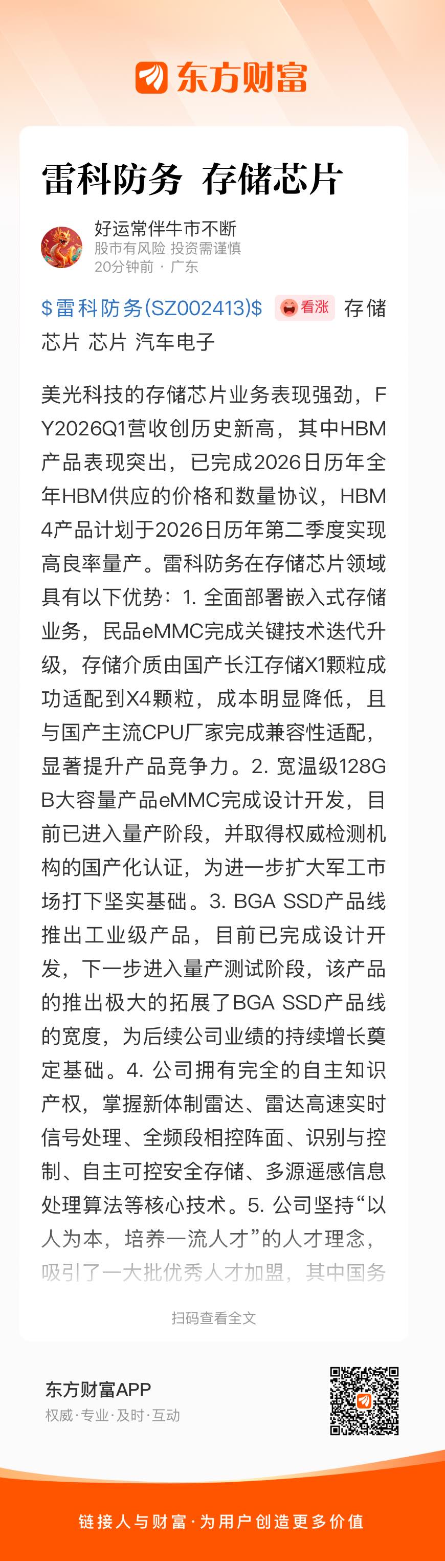 美光科技的存储芯片业务表现强劲,FY2026Q1营收创历史新高,其中HBM产品表现突出,已完成2026日历年全年HBM供应的价格和数量协议,HBM4产品计划于2026日历年第二季度实现高良率量产。雷科防务在存储芯片领域具有以下优势:1. 全面部署嵌入式存储业务,民品eMMC完成关键技术迭代升级,存储介质由国产长江存储X1颗粒成功适配到X4颗粒,成本明显降低,且与国产主流CPU厂家完成兼容性适配,显著提升产品竞争力。2. 宽温级128GB大容量产品eMMC完成设计开发,目前已进入量产阶段,并取得权威检测机构的国产化认证,为进一步扩大军工市场打下坚实基础。3. BGA SSD产品线推出工业级产品,目前已完成设计开发,下一步进入量产测试阶段,该产品的推出极大的拓展了BGA SSD产品线的宽度,为后续公司业绩的持续增长奠定基础。4. 公司拥有完全的自主知识产权,掌握新体制雷达、雷达高速实时信号处理、全频段相控阵面、识别与控制、自主可控安全存储、多源遥感信息处理算法等核心技术。5. 公司坚持“以人为本,培养一流人才”的人才理念,吸引了一大批优秀人才加盟,其中国务院特殊津贴2人、北京市科学技术奖杰出青年中关村奖1人。6. 公司掌握多源遥感信息处理算法、自主高性能处理芯片、新体制雷达系统、全频段相控阵面、毫米波雷达、自主可控存储、识别与控制、多型天线技术、运动平台与伺服控制技术等多项核心技术。7. 公司始终坚持自主创新,不断加大技术研发的投入,核心子公司分别获得国家以及各地政府肯定。8. 公司具有专业的核心芯片研发团队,专注于星上实时处理、雷达信号处理、信息安全应用等领域的自主芯片研发,目前已完成星上光学遥感图像处理芯片、星上一体化SAR成像处理芯片、SSD安全存储控制芯片等,存储芯片产品获评国家专利密集型产品。9. 依托于公司的综合优势及完整的产业化布局,在雷达系统、卫星应用、智能控制、安全存储、智能网联等产业方向上,通过上下游合作、兼并收购等方式,资源整合优势显著。