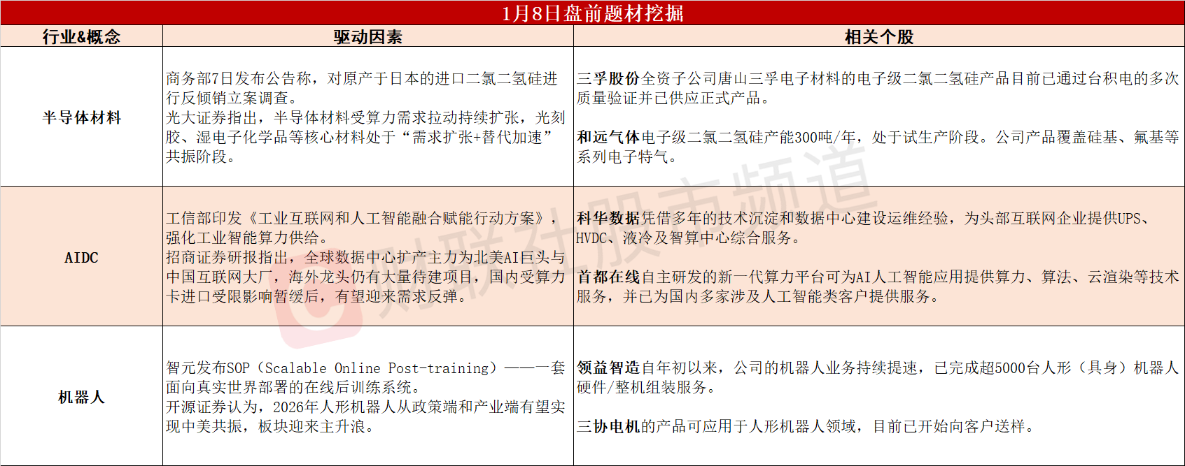 ①我国对日本二氯二氢硅发起反倾销调查,半导体材料“需求扩张+替代加速”共振。②工信部发文强化工业智能算力供给,AIDC建设有望迎来需求反弹。③智元发布机器人SOP训练系统,机构称26年机器人板块或迎来主升浪。