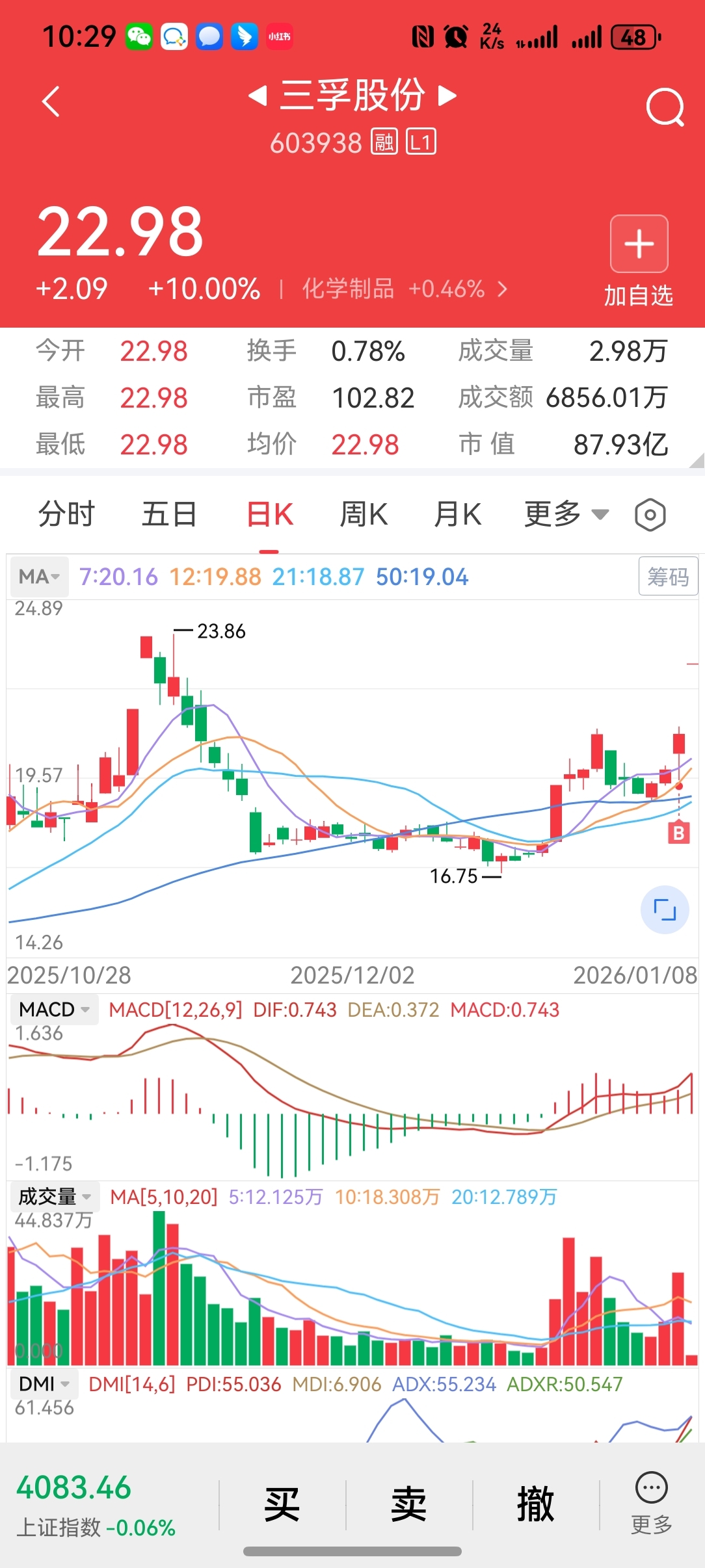 $三孚股份(SH603938)$ 这波操作得几分,昨天刚最低位半仓买入的,没来的及打满仓位就拉升了。