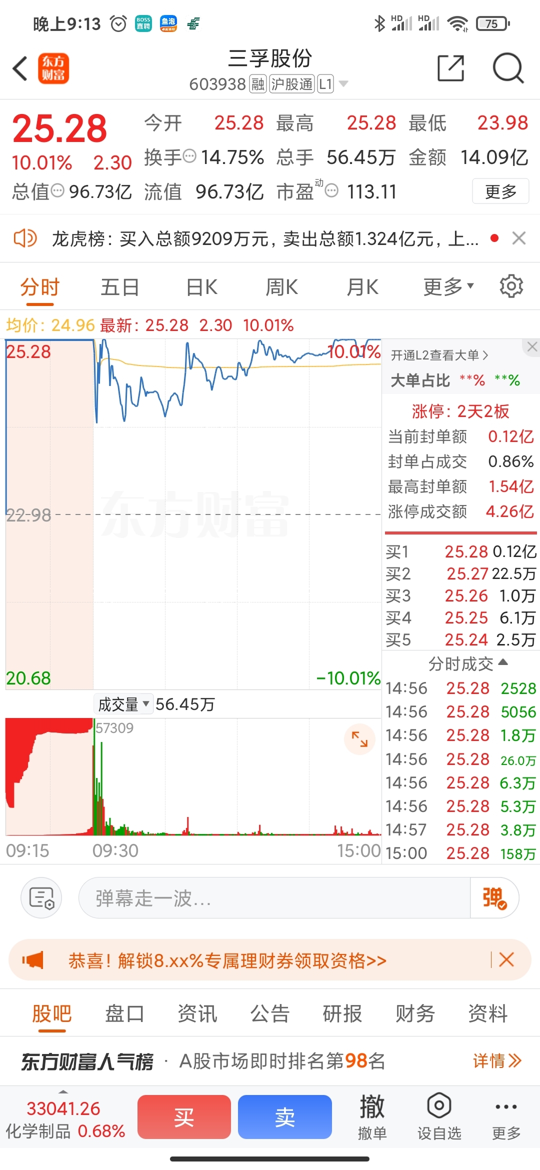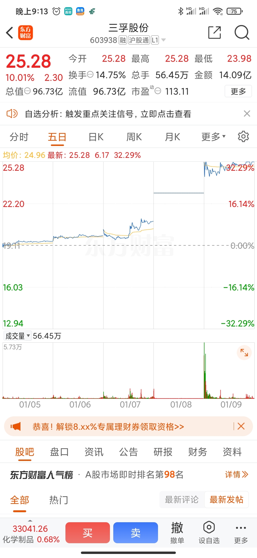 $三孚股份(SH603938)$ 这么大卖盘还没跌下耒,周一看你怎么玩