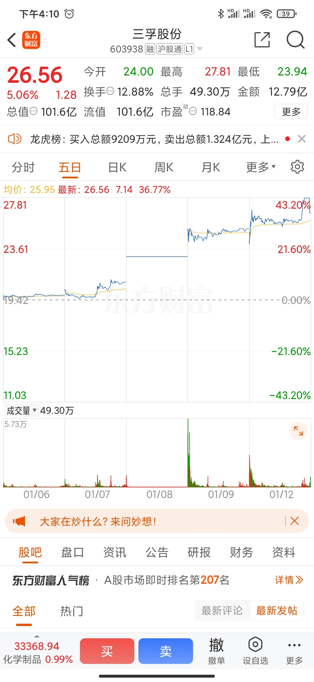 $三孚股份(SH603938)$ 今天洨低开