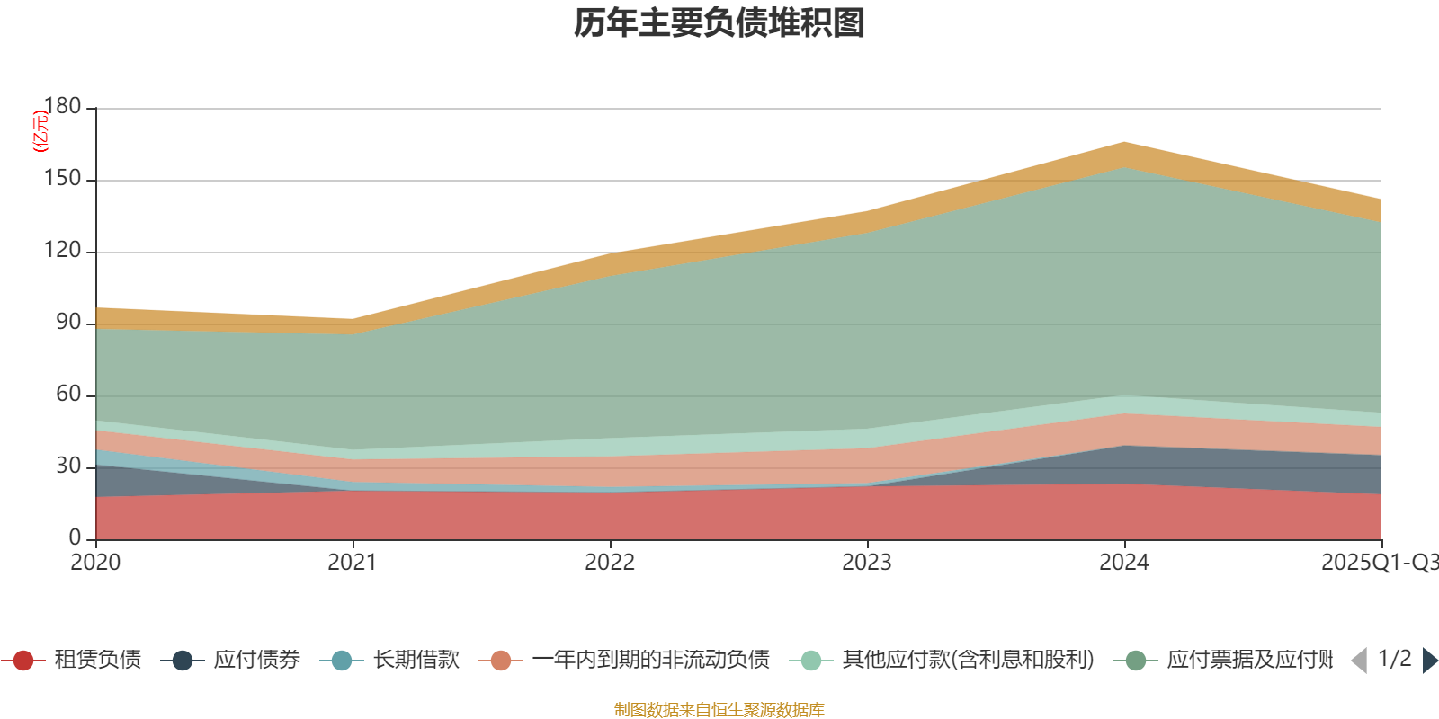 负债重大变化方面,截至2025年三季度末,公司应付票据及应付账款较上年末减少16.33%,占公司总资产比重下降3.47个百分点;租赁负债较上年末减少19.08%,占公司总资产比重下降1.09个百分点;应付债券较上年末增加2.34%,占公司总资产比重上升0.56个百分点;其他应付款(含利息和股利)较上年末减少23.67%,占公司总资产比重下降0.5个百分点。