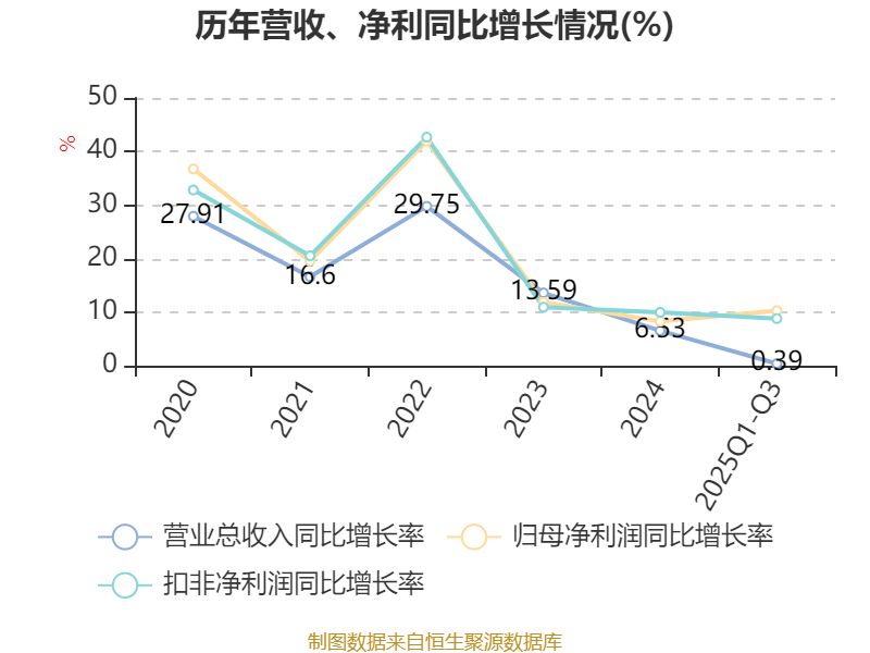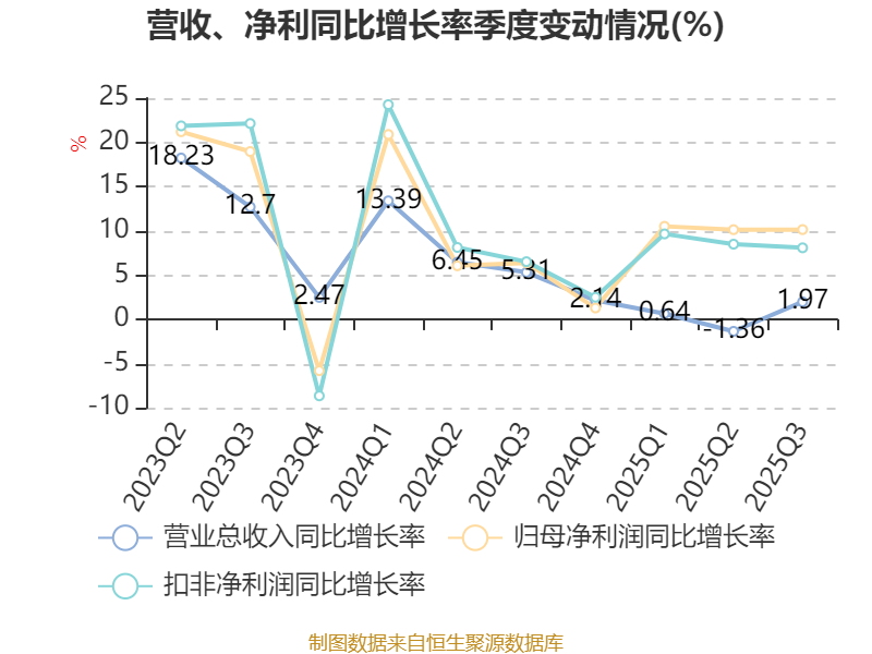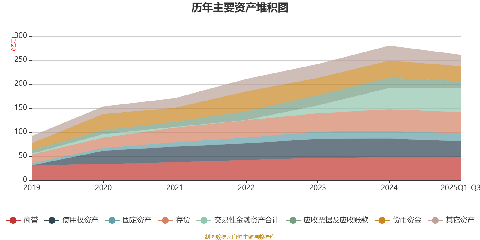 资产重大变化方面,截至2025年三季度末,公司交易性金融资产合计较上年末增加13.34%,占公司总资产比重上升3.41个百分点;应收票据及应收账款较上年末减少30.82%,占公司总资产比重下降1.96个百分点;商誉较上年末增加0.06%,占公司总资产比重上升1.26个百分点;使用权资产较上年末减少15.18%,占公司总资产比重下降1.25个百分点。