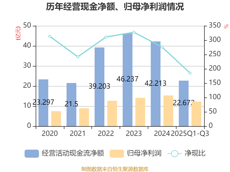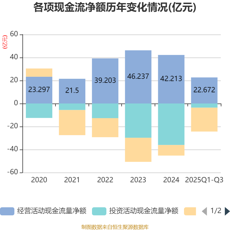 2025年前三季度,公司经营活动现金流净额为22.67亿元,同比下降32.16%;筹资活动现金流净额-20.76亿元,同比减少19.85亿元;投资活动现金流净额-3.63亿元,上年同期为-36.7亿元。
