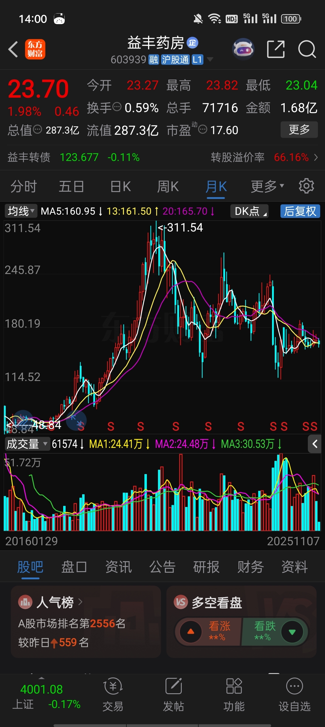 $益丰药房(SH603939)$ 这种除权的票,下跌趋势,还在半山腰啊。