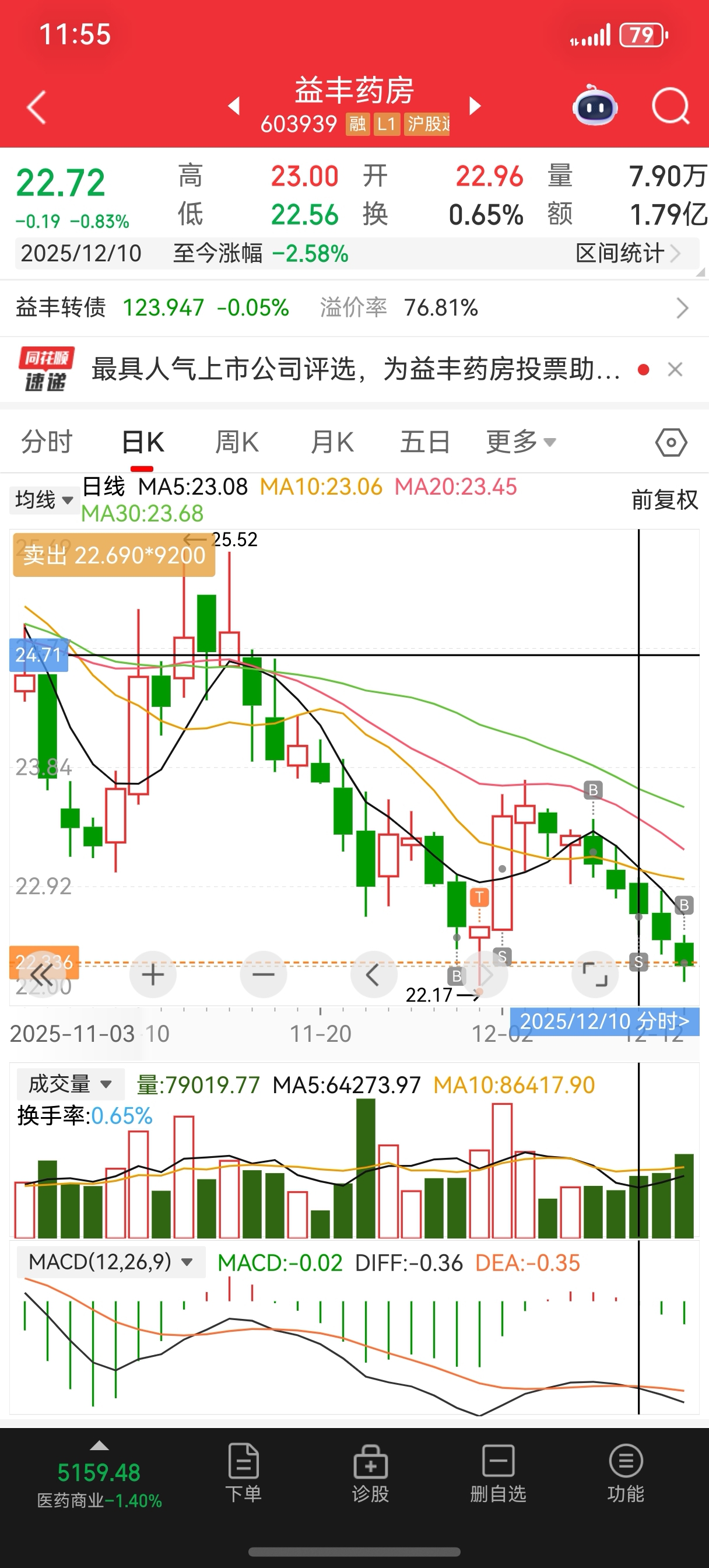 $益丰药房(SH603939)$ 还好22.69卖了,在舍得拿回来这边亏的两个点。