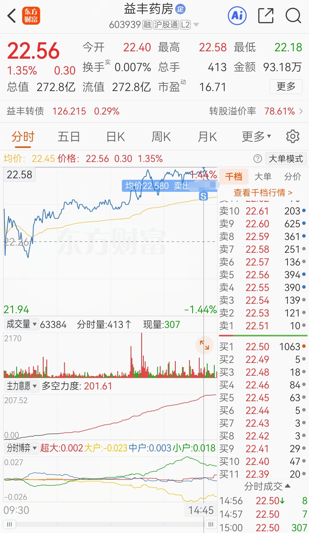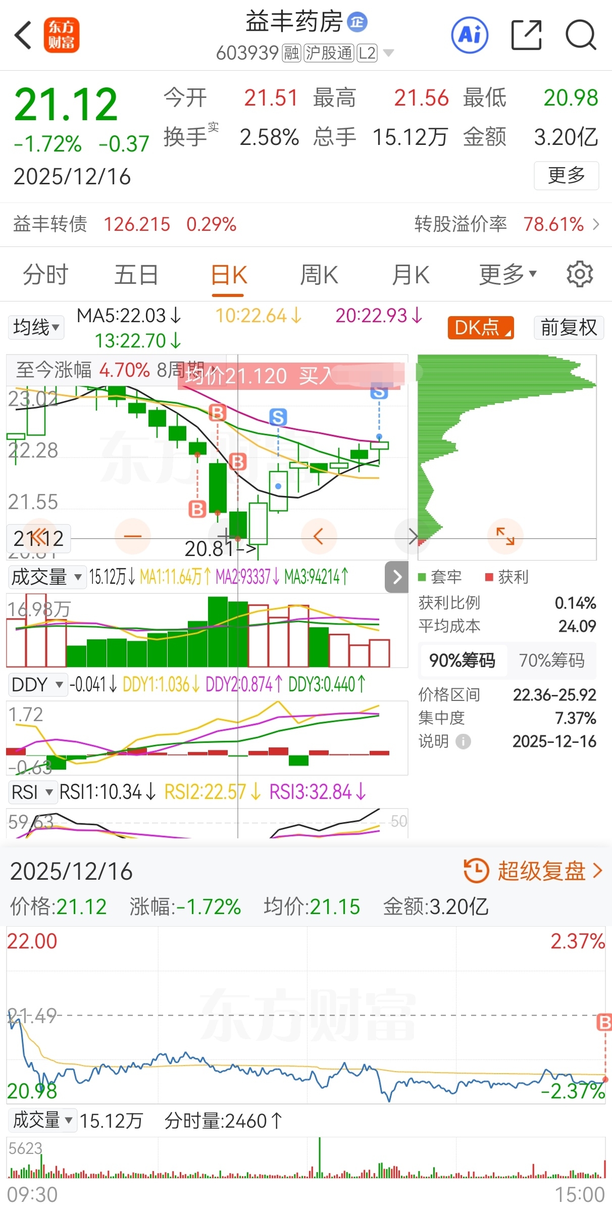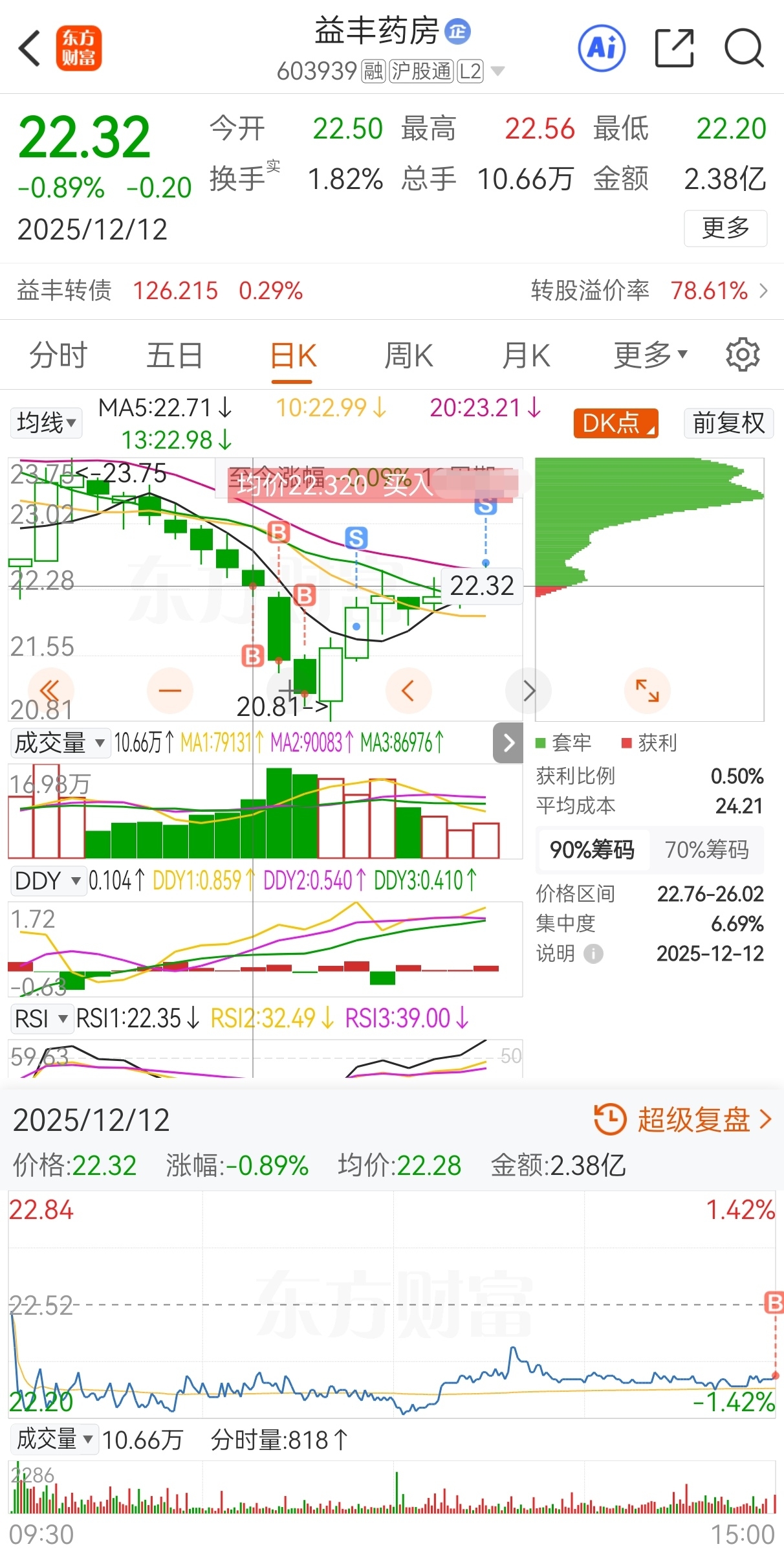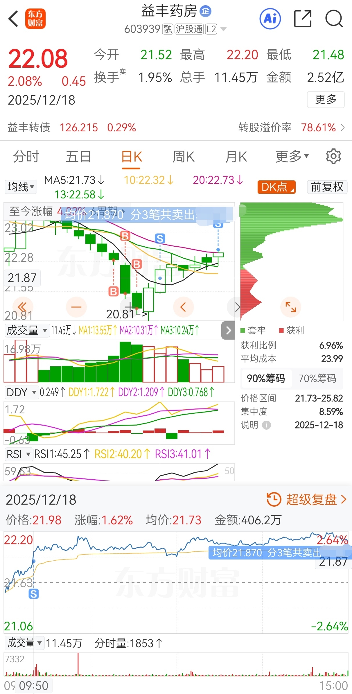 $益丰药房(SH603939)$ 原计划今买明卖,实际22.32买,21.49加仓,21.12再加仓,21.87减仓,22.58卖,实盘短线套利益丰药房,成功收米走人!