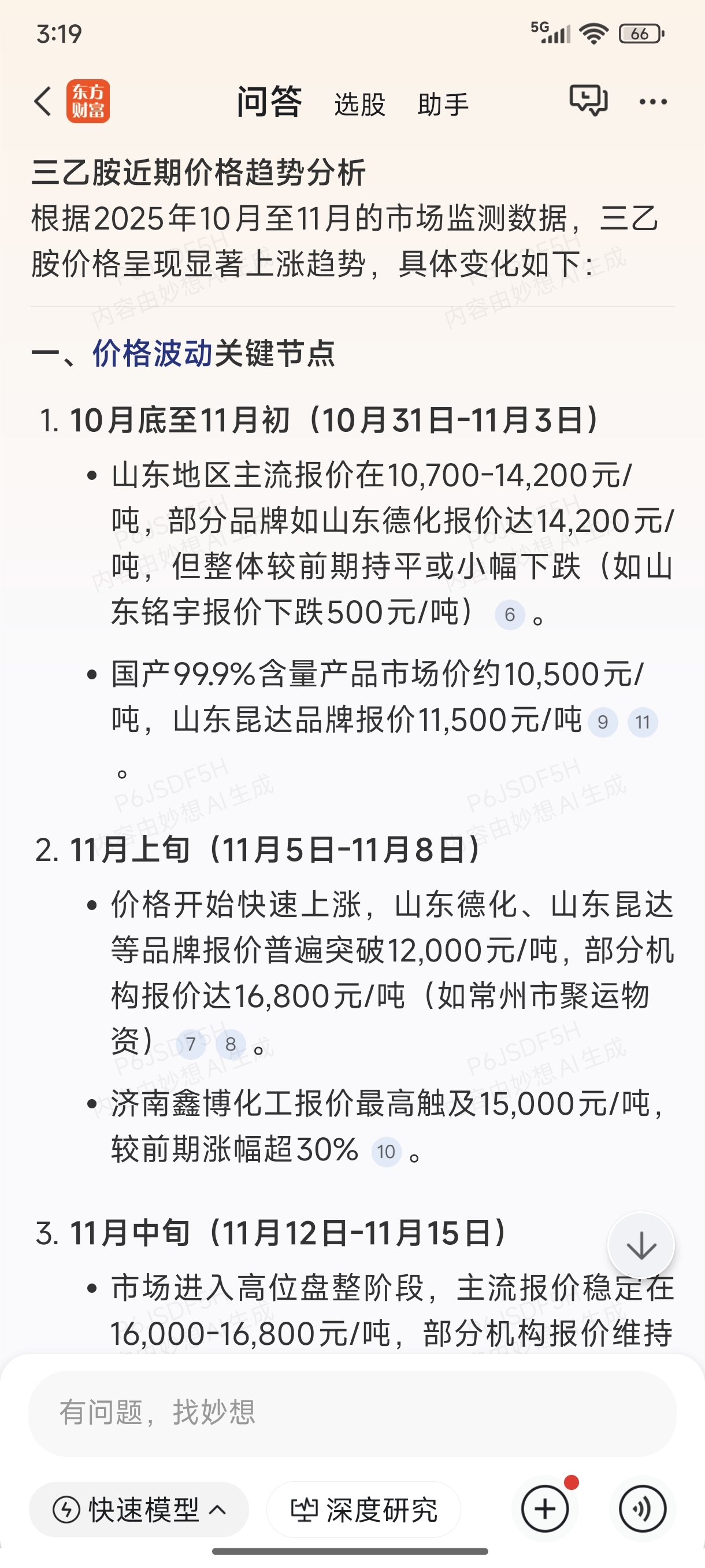 说明2:化工品的价格受地区影响非常大(运输路径因素等),生意社的报价很差,中国报告大厅的数据非常全面、但太复杂,因此指令妙想依据中国报告大厅数据统计出三乙胺10月-11月13日的价格趋势。