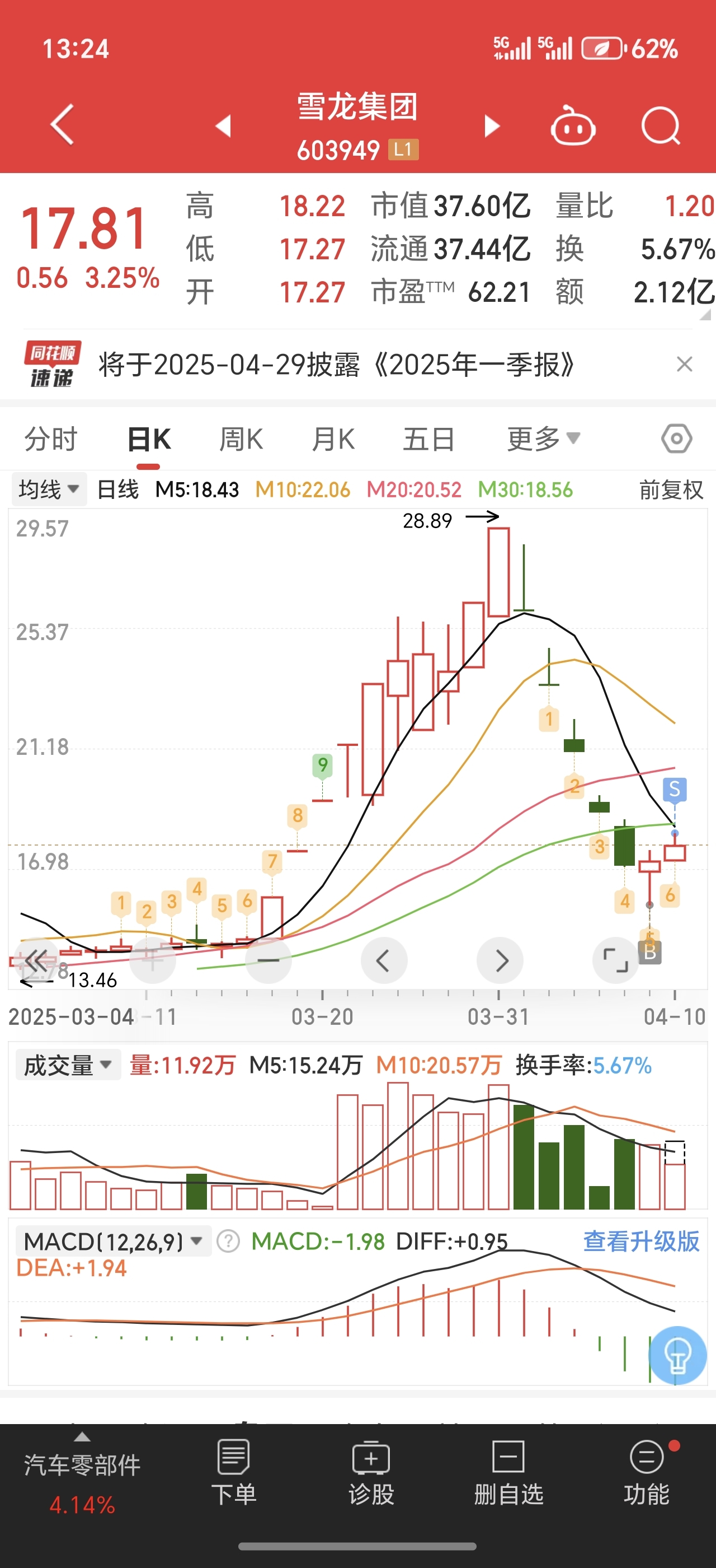 $雪龙集团(SH603949)$ 精准抄底,今天跑路