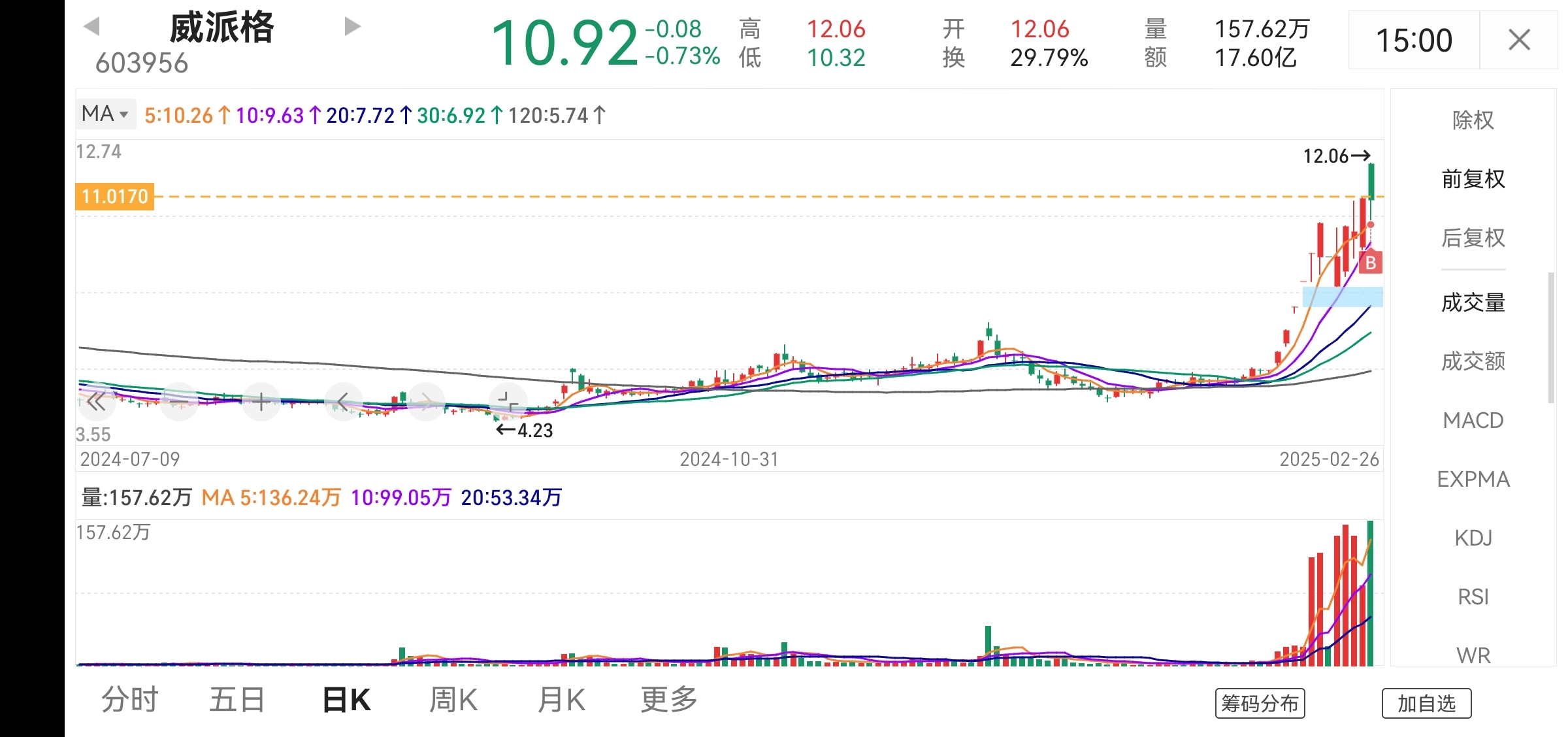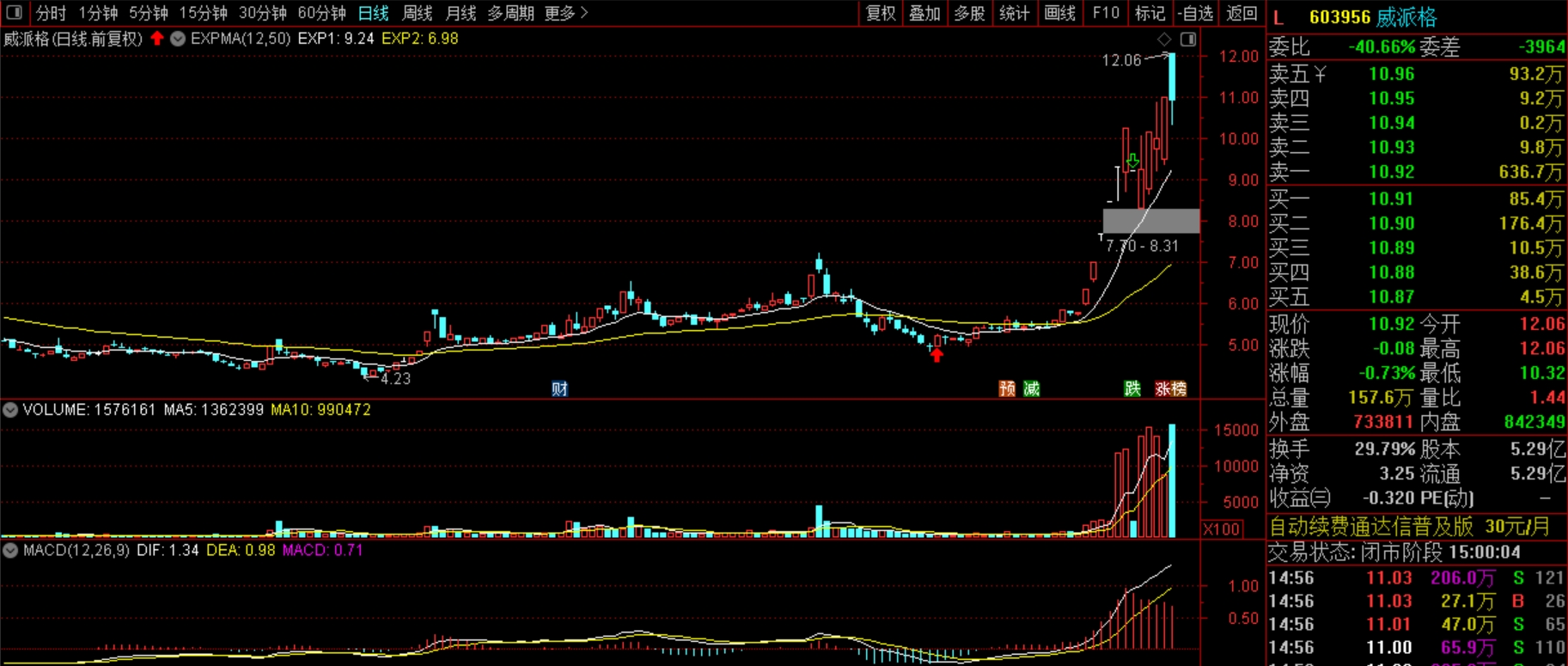 $威派格(SH603956)$ DS板块最近是调整走势,但板块内个股轮动明显。该股作为板块内盘子偏小个股,有资金在运作。昨天涨停,今天涨停开盘有资金兑现,快速回落,之后大幅震荡,收盘微跌。从形态上看确实有资金出货迹象,但该股盘小,也不排除有资金运作走趋势二波的可能性。今天建仓,博弈二波预期,不及预期随时走人!