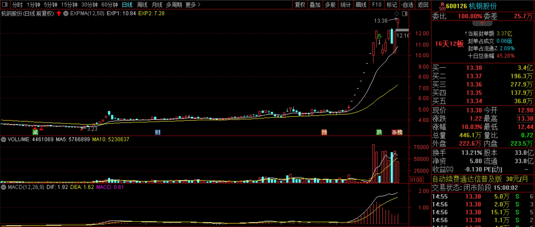 杭钢股份:DS板块内个股也是不断轮动走强,今天该股涨停新高,成为DS的新龙头。
