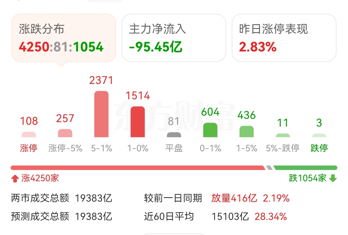 市场个股涨多跌少,沪深两市上涨4250只其中涨停108只,两市平盘81只,两市下跌1054只其中跌停3只。