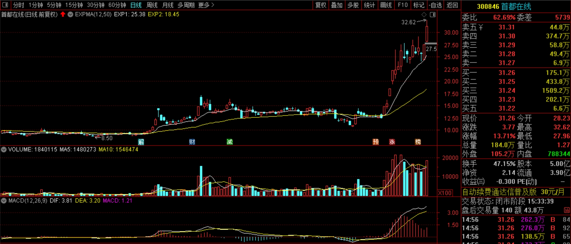 首都在线:每日互动的二次监控给了该股表现走强的机会,今天放量上涨新高,成为DS板块创业板阶段性龙头。