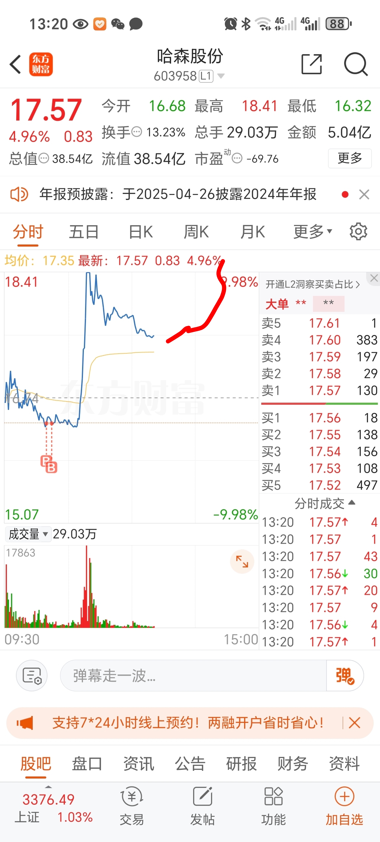 $哈森股份(SH603958)$ 今天这走势要是涨停了,根据我多年分析,最少还有三个板
