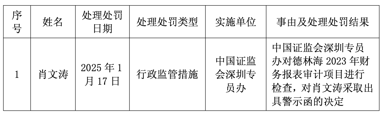 中国证监会深圳专员办对德林海2023年财务报表审计项目进行检查,对肖文涛采取出具警示函的决定。时间发生在今年1月17日。