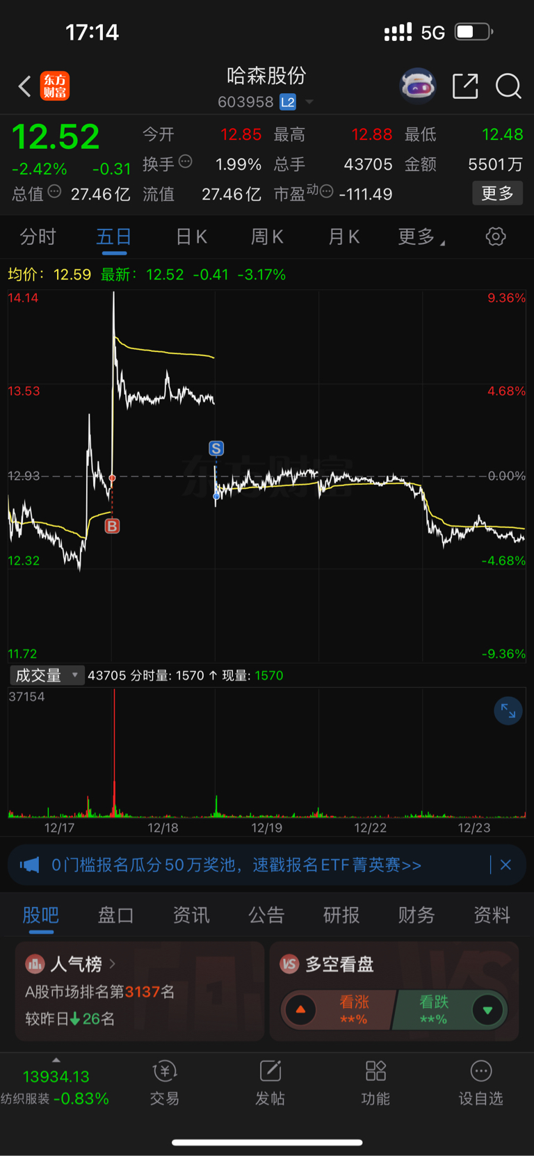 $哈森股份(SH603958)$ 看图就知道了 完全不给肉吃