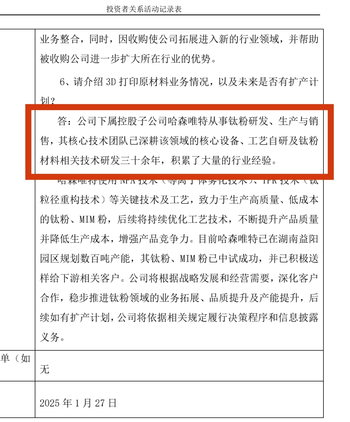 另一个子公司哈森唯特主攻3d打印,钛粉mim粉送样给下游公司并准备在湖南扩产百吨产能,目前盈利较小没写出来被村长警告