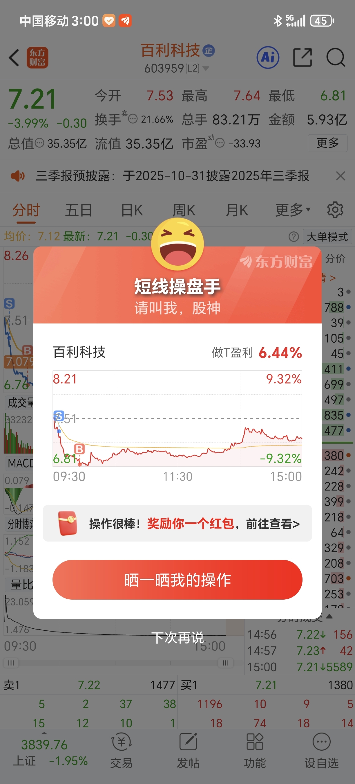 $百利科技(SH603959)$ 这几天长线短线太难玩了只有做t才可以玩,不要怕卖飞,只要赚钱跑,任何点都是对的,哪怕卖完涨停,也不要后悔