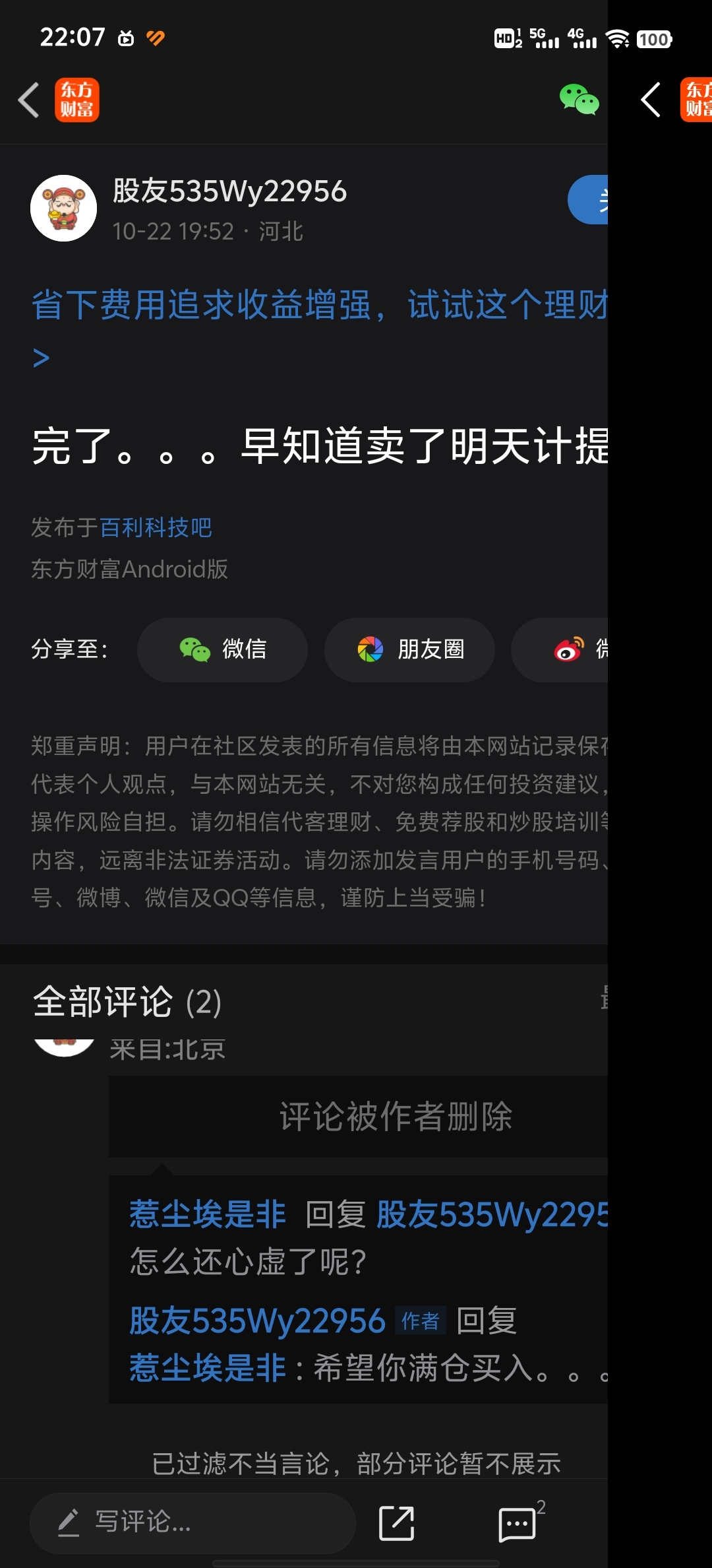 温馨提示: 1.根据《证券法》规定,禁止编造、传播虚假信息或者误导性信息,扰乱证券市场;2.用户在本社区发表的所有资料、言论等仅代表个人观点,与本网站立场无关,不对您构成任何投资建议。用户应基于自己的独立判断,自行决定证券投资并承担相应风险。《东方财富社区管理规定》