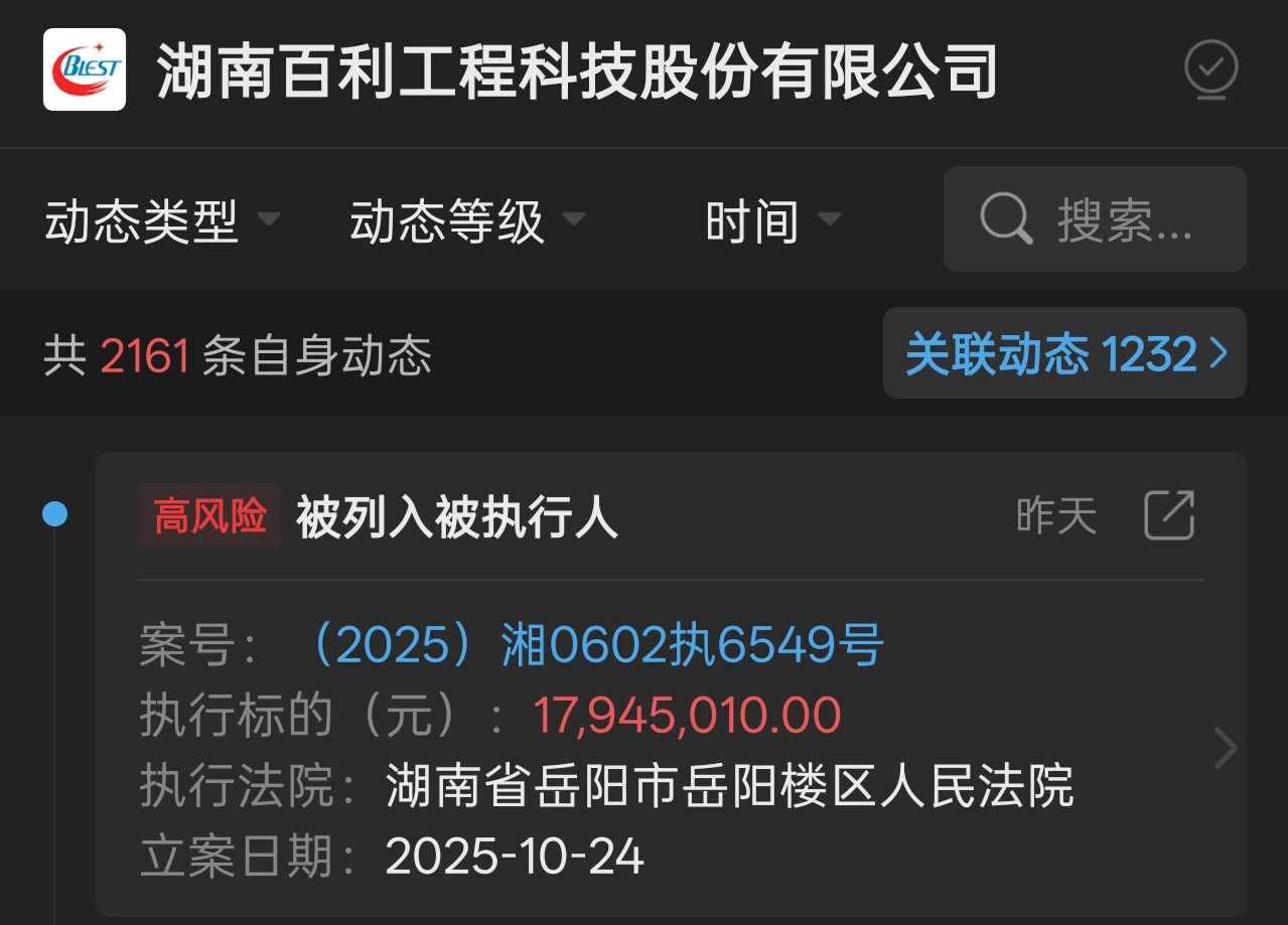 $百利科技(SH603959)$ 百利科技怎么这么多执行欠钱的,24号被执行1700万,这个企业到底还欠多少钱啊。