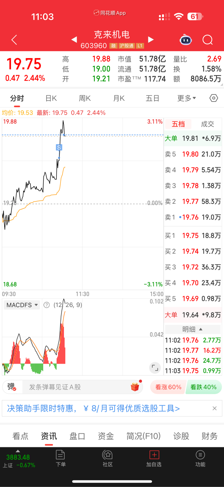 $克来机电(SH603960)$ 越涨越出,这玩意下午不跌回来,周四周五也的回来,坐等,感谢