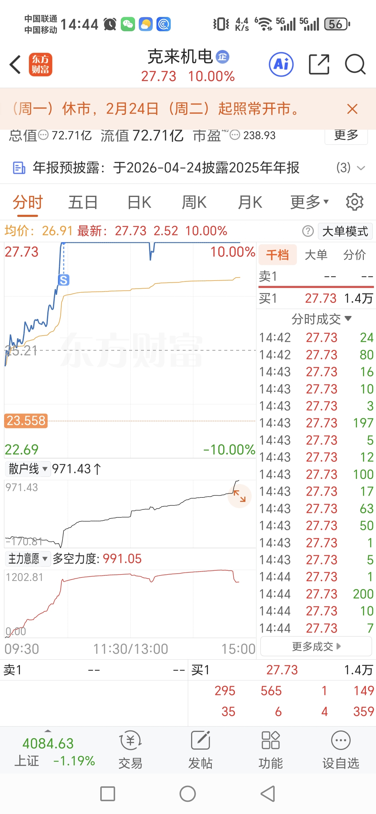 $克来机电(SH603960)$ 过完节开盘稳定冲高,冲高后小散接盘,第二天大跌让小散高位接盘站岗