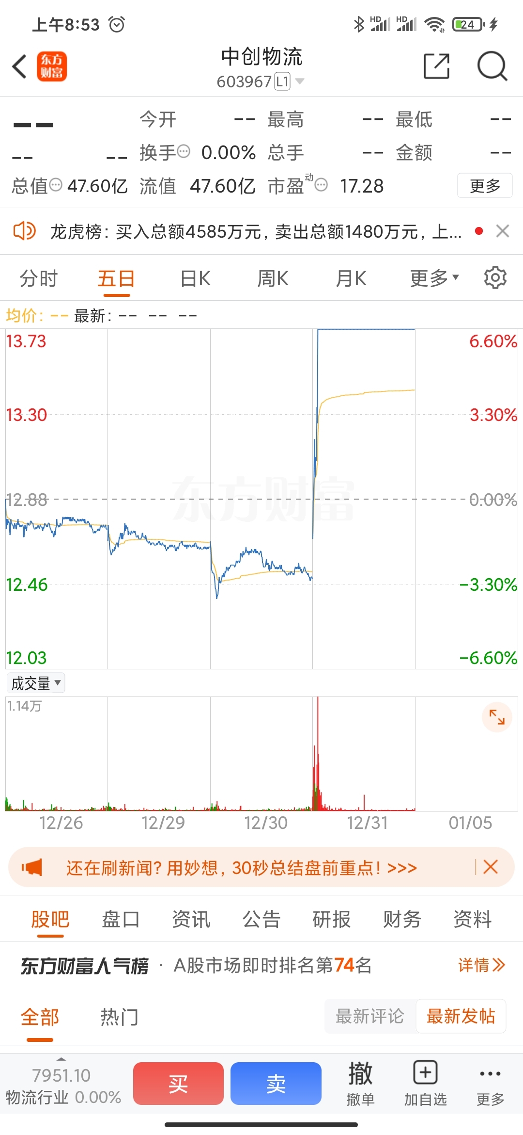 $中创物流(SH603967)$
