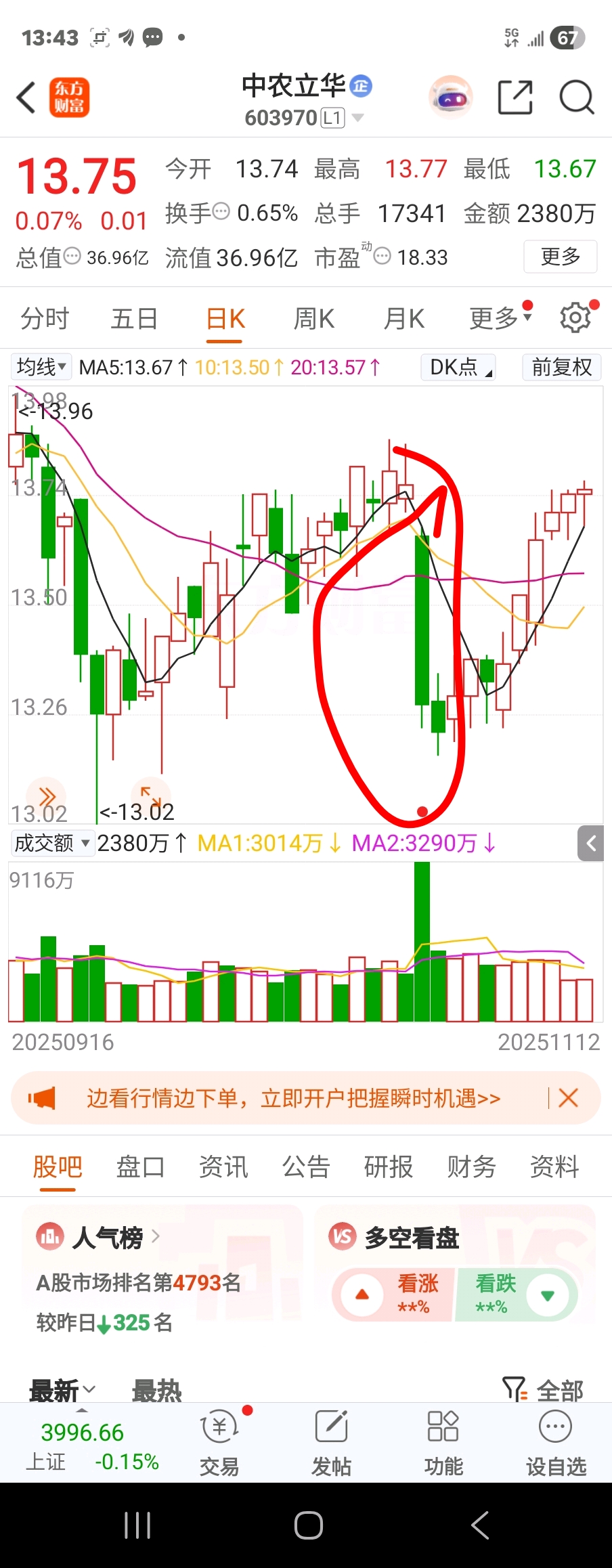 $中农立华(SH603970)$ 如图哈哈每天小碎步,一根大阴跌完