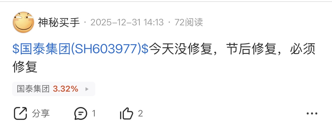 $国泰集团(SH603977)$ 修没修复? 咱只用实力证明自己