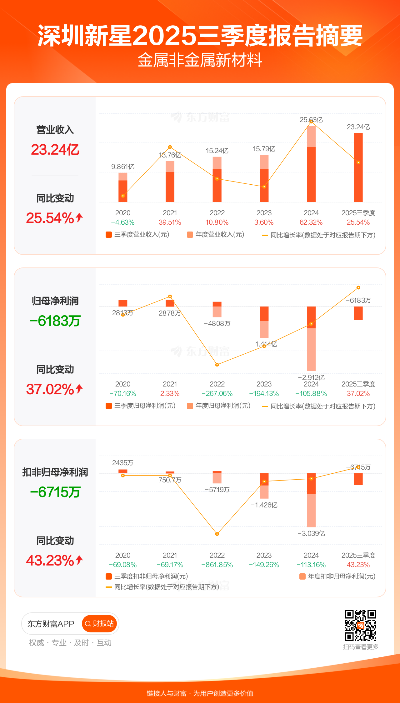 深圳新星10月31日发布2025年三季报显示,公司前三季实现营业收入23.24亿元,同比增长25.54%;归母净利润-6182.98万元;扣非归母净利润-6714.61万元。