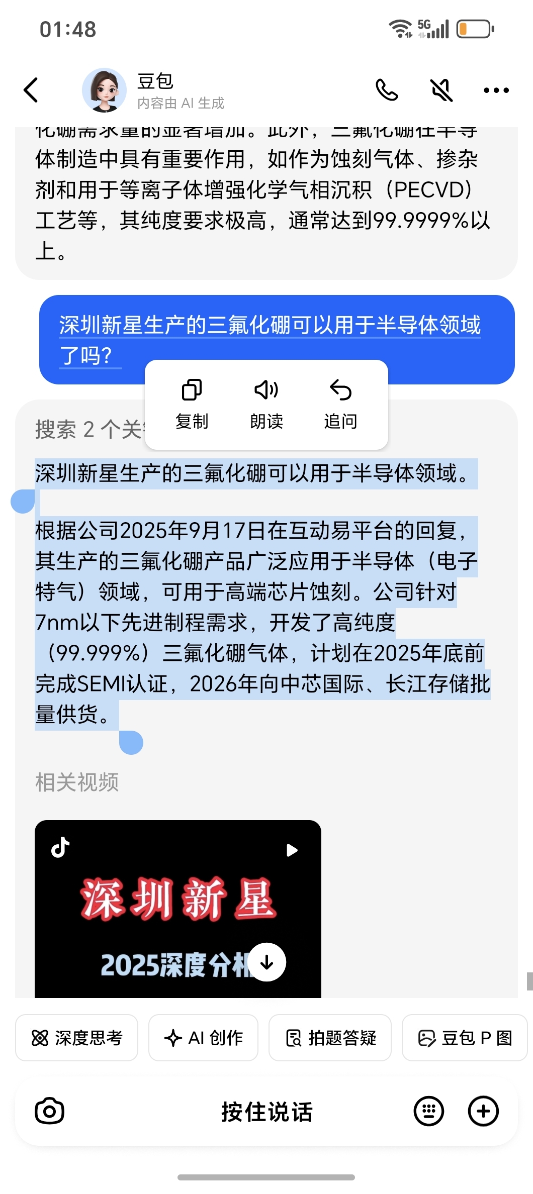 根据公司2025年9月17日在互动易平台的回复,其生产的三氟化硼产品广泛应用于半导体(电子特气)领域,可用于高端芯片蚀刻。公司针对7nm以下先进制程需求,开发了高纯度(99.999%)三氟化硼气体,计划在2025年底前完成SEMI认证,2026年向中芯国际、长江存储批量供货。